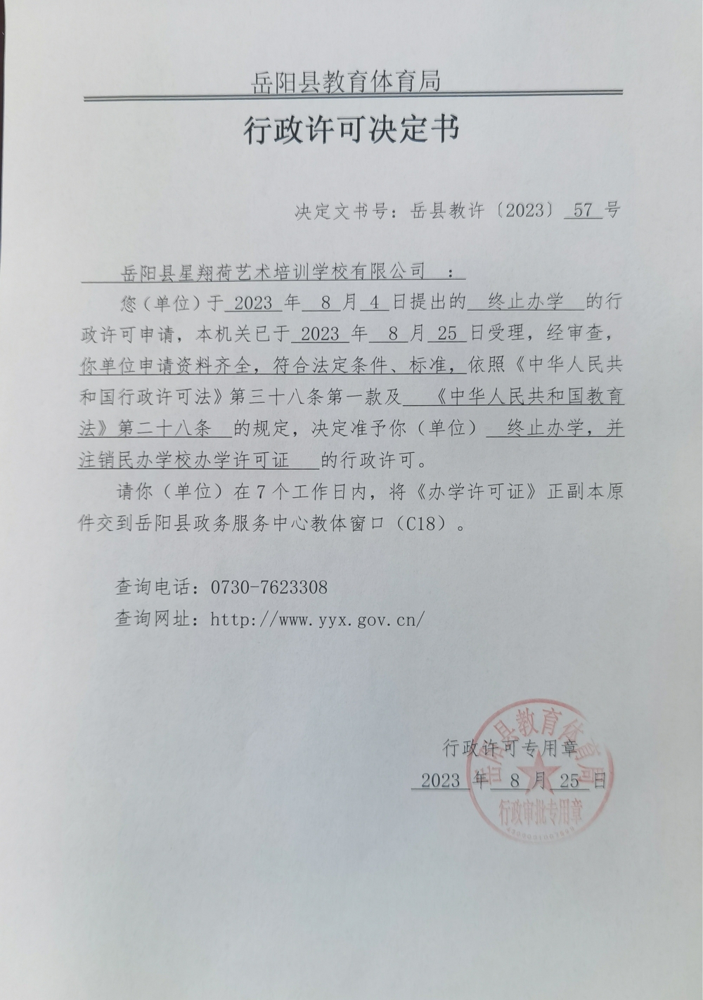 关于准予岳阳县星翔荷艺术培训学校有限公司终止办学的许可决定