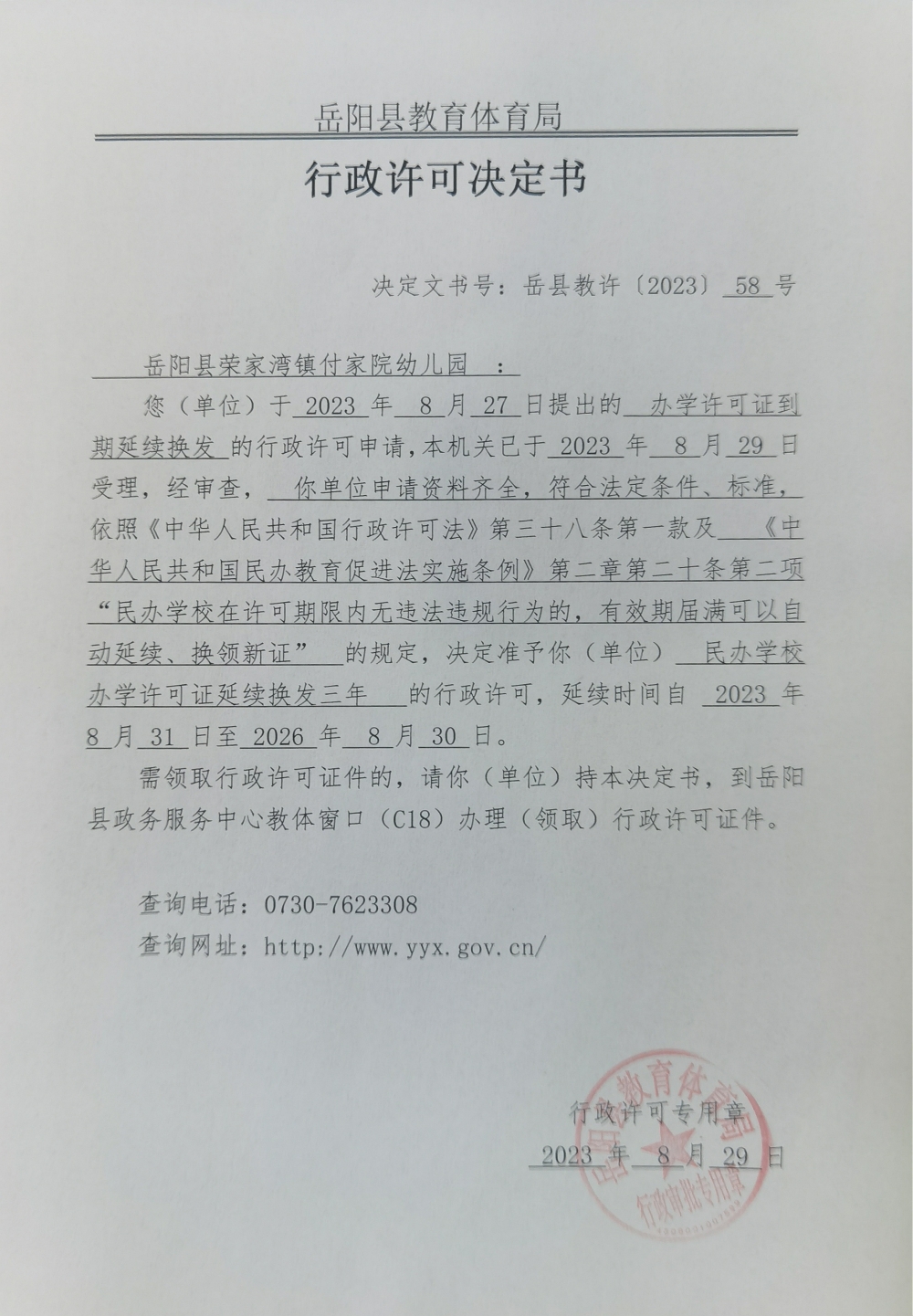 关于准予岳阳县荣家湾镇付家院幼儿园办学许可证到期延续换发的许可决定