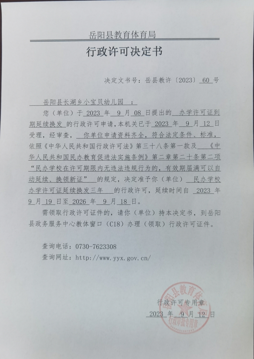 关于准予岳阳县长湖乡小宝贝幼儿园办学许可证到期延续换发的许可决定