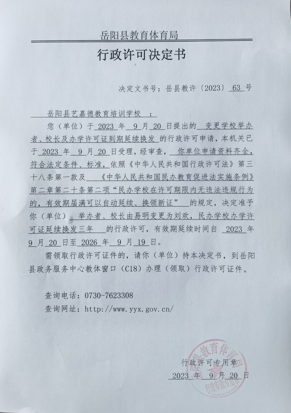 关于准予岳阳县艺嘉德教育培训学校变更学校举办者、校长及办学许可证到期延续换发的许可决定