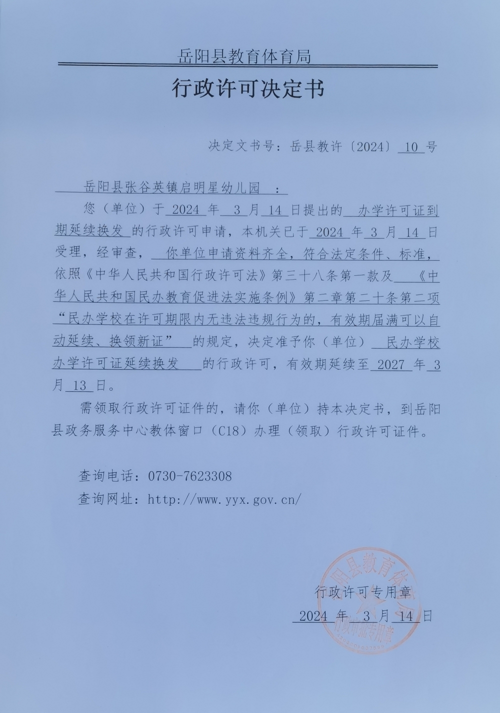 关于准予岳阳县张谷英镇启明星幼儿园办学许可证到期延续换发的许可决定