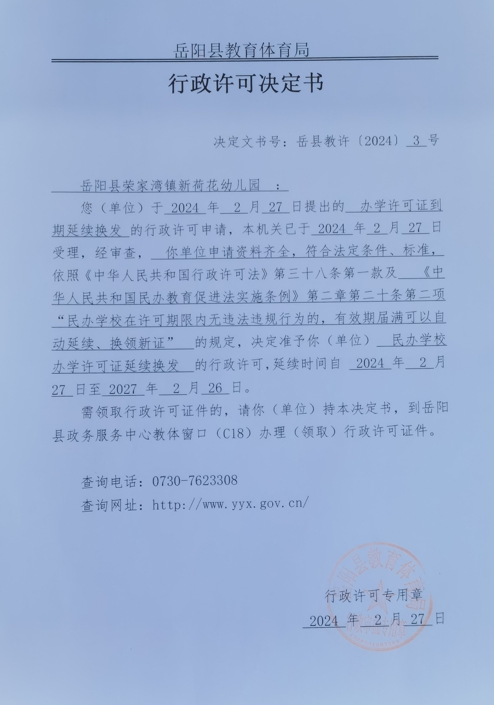 关于准予岳阳县荣家湾镇新荷花幼儿园办学许可证到期延续换发的许可决定