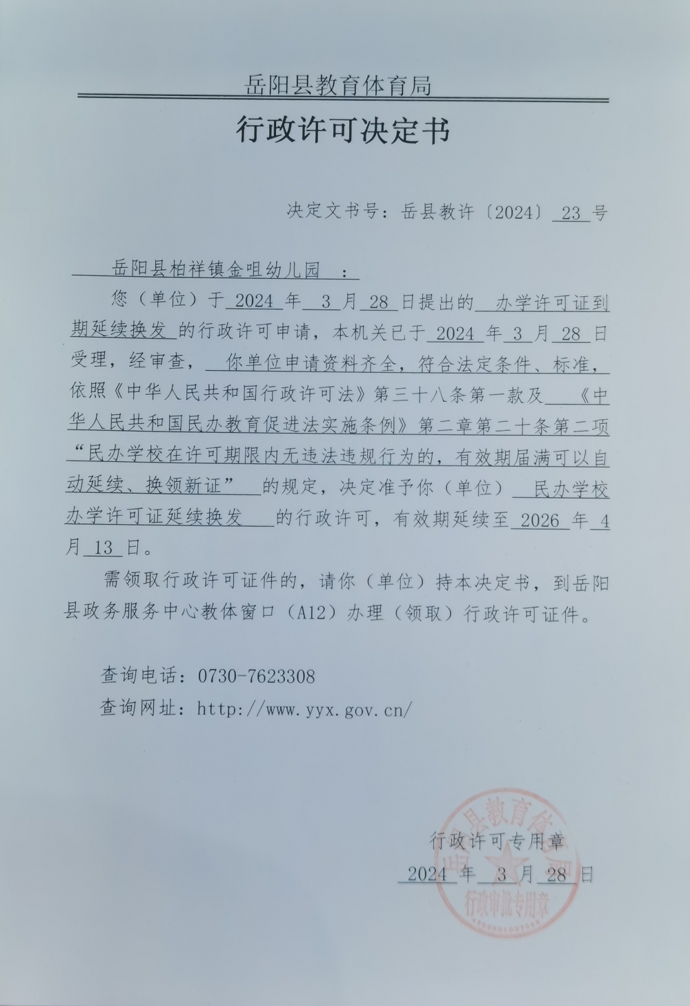 关于准予岳阳县柏祥镇金咀幼儿园办学许可证到期延续换发的许可决定
