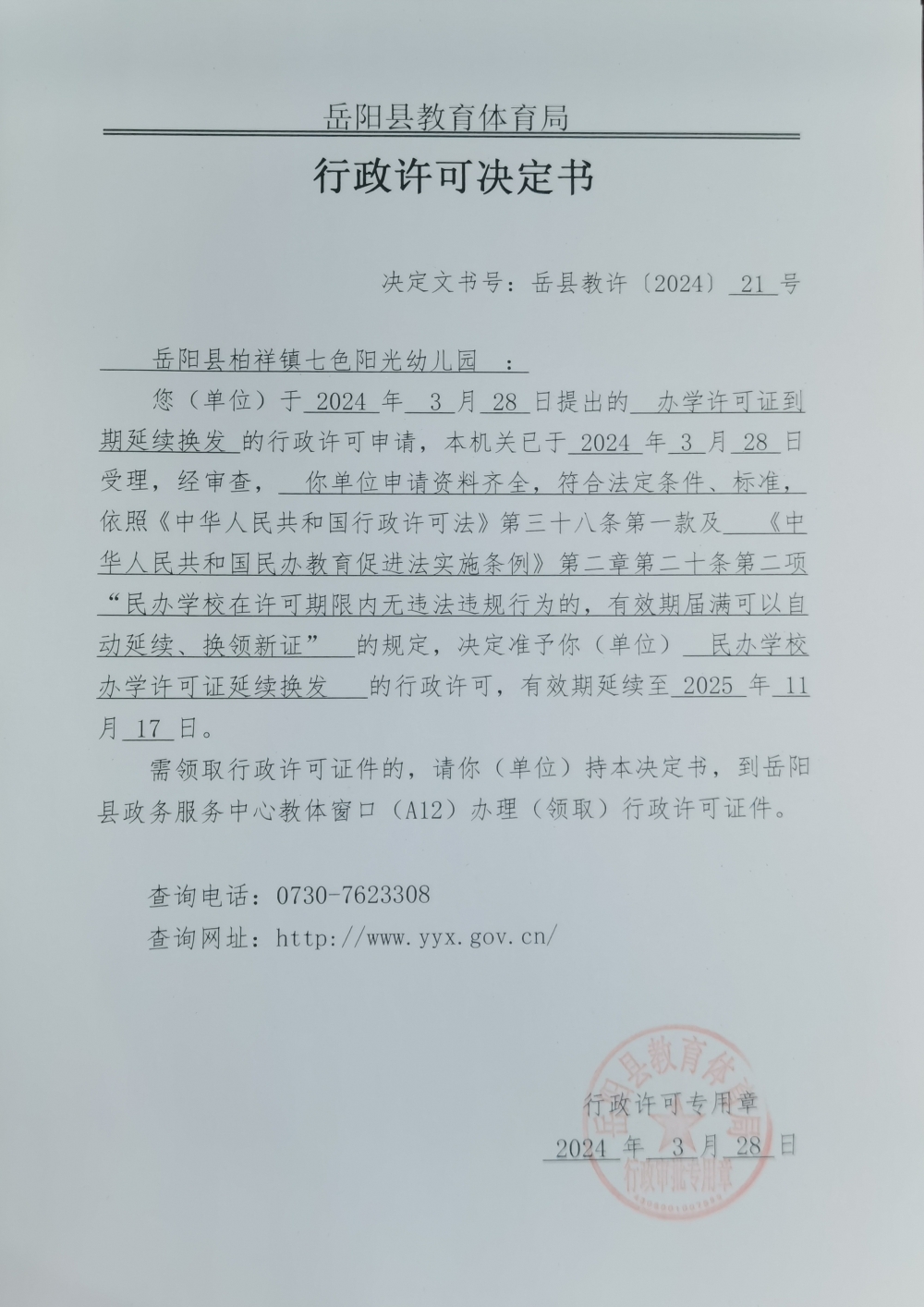 关于准予岳阳县柏祥镇七色阳光幼儿园办学许可证到期延续换发的许可决定