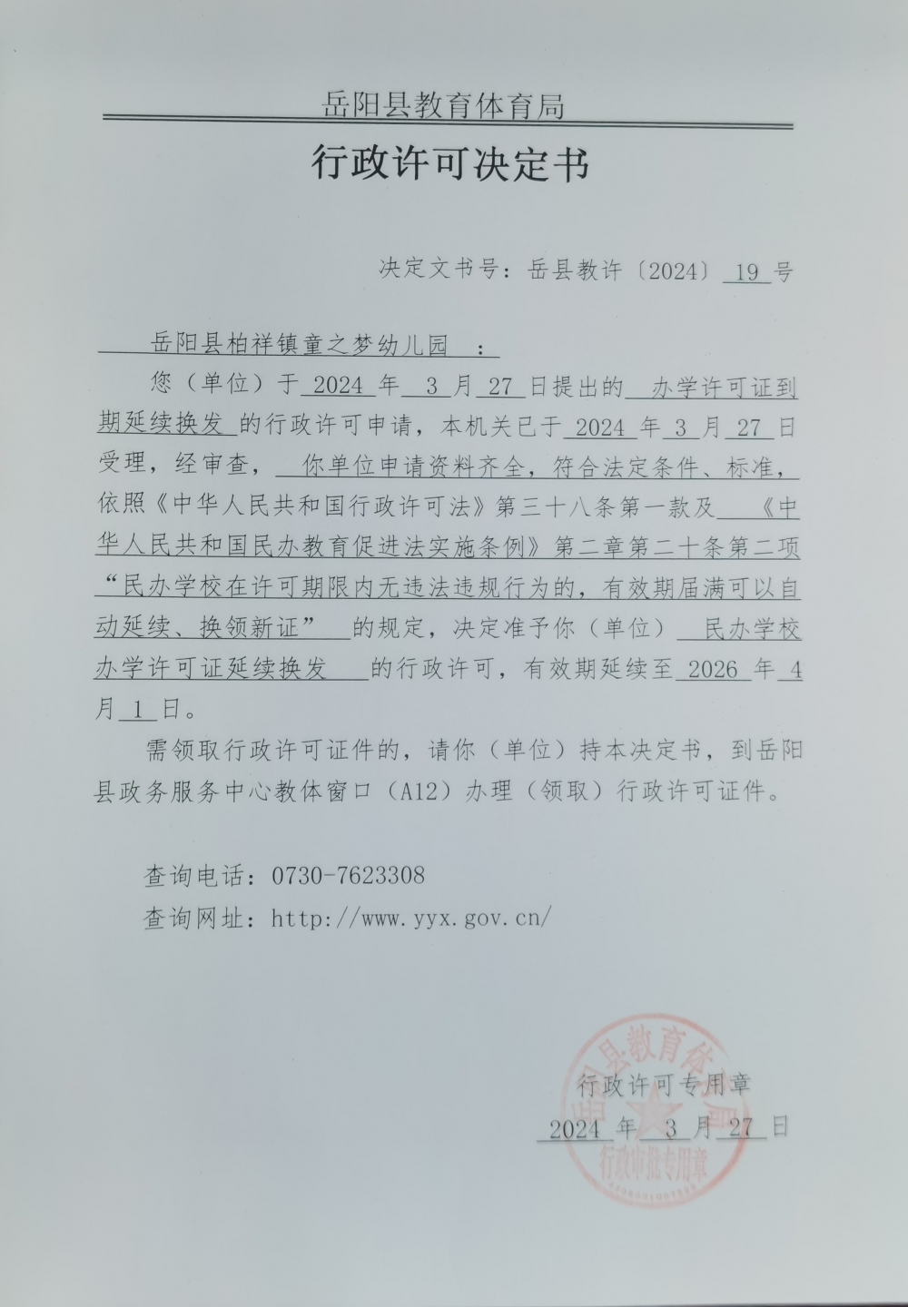 关于准予岳阳县柏祥镇童之梦幼儿园办学许可证到期延续换发的许可决定