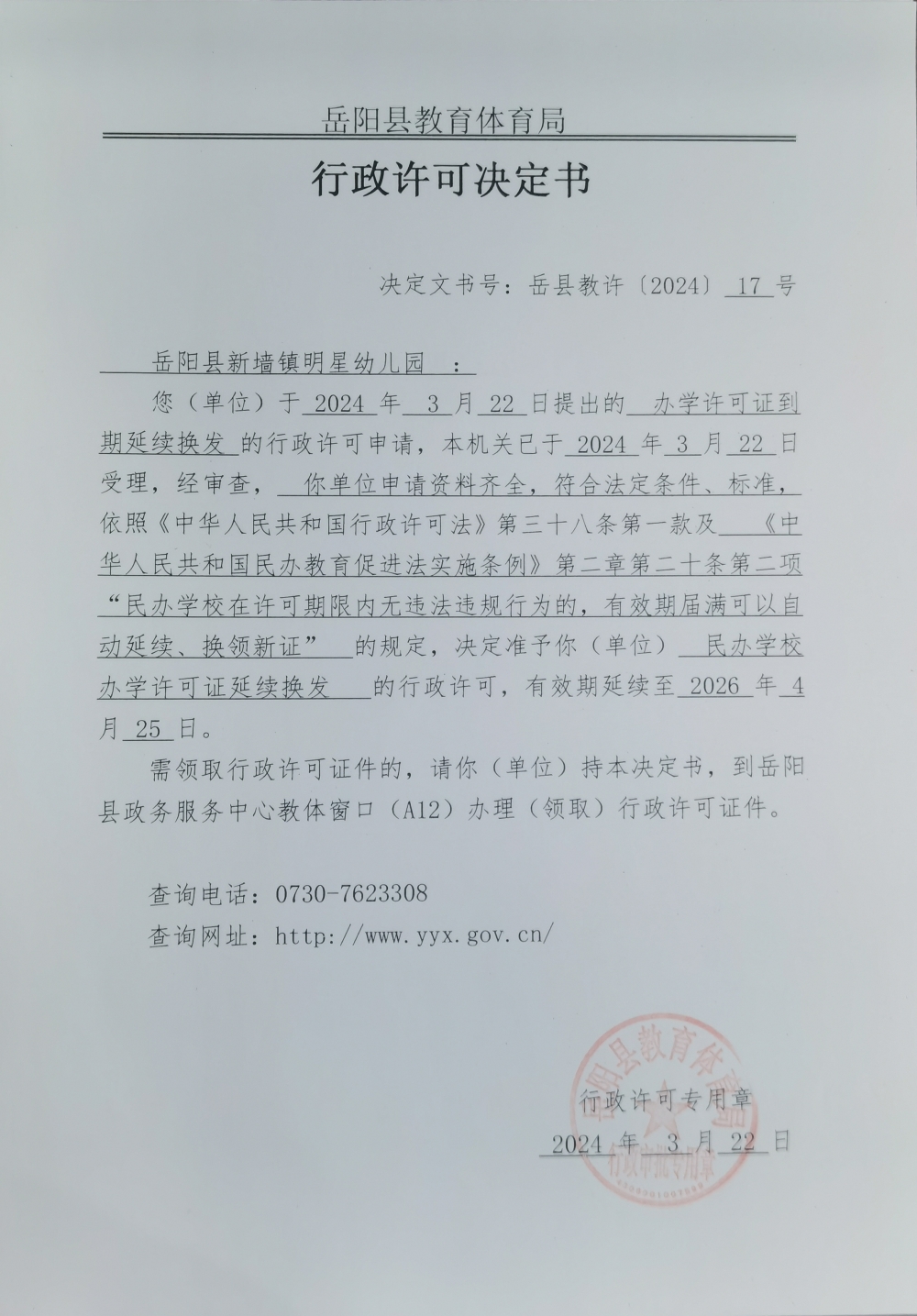 关于准予岳阳县新墙镇明星幼儿园办学许可证到期延续换发的许可决定