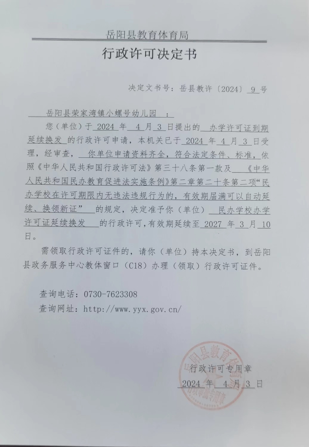关于准予岳阳县荣家湾镇小螺号幼儿园办学许可证到期延续换发的许可决定