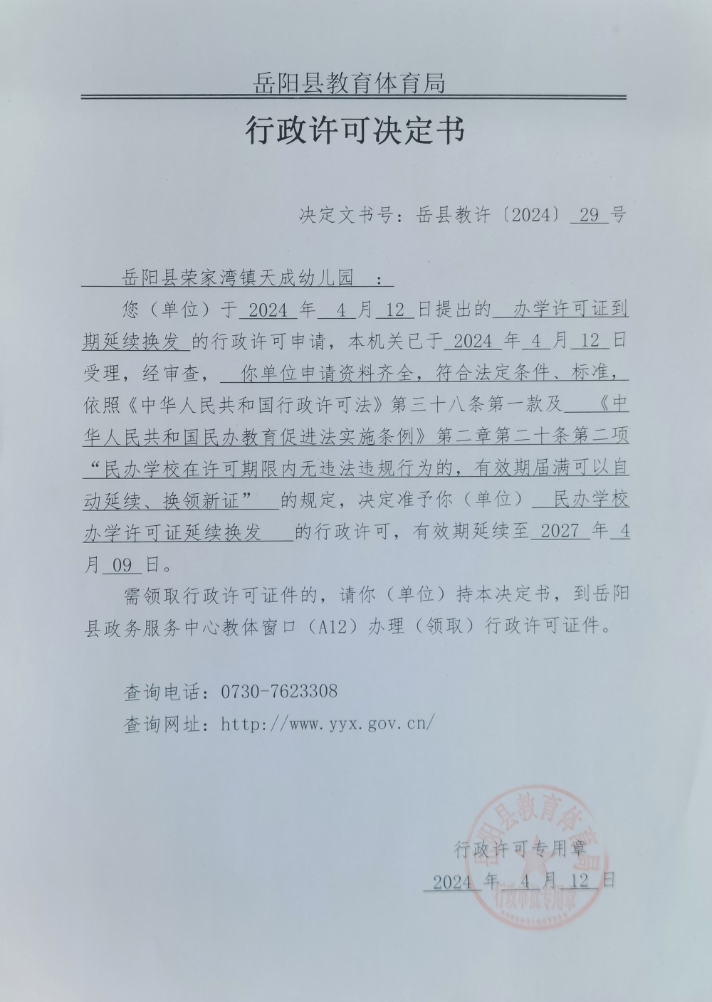 关于准予岳阳县荣家湾镇天成幼儿园办学许可证到期延续换发的许可决定
