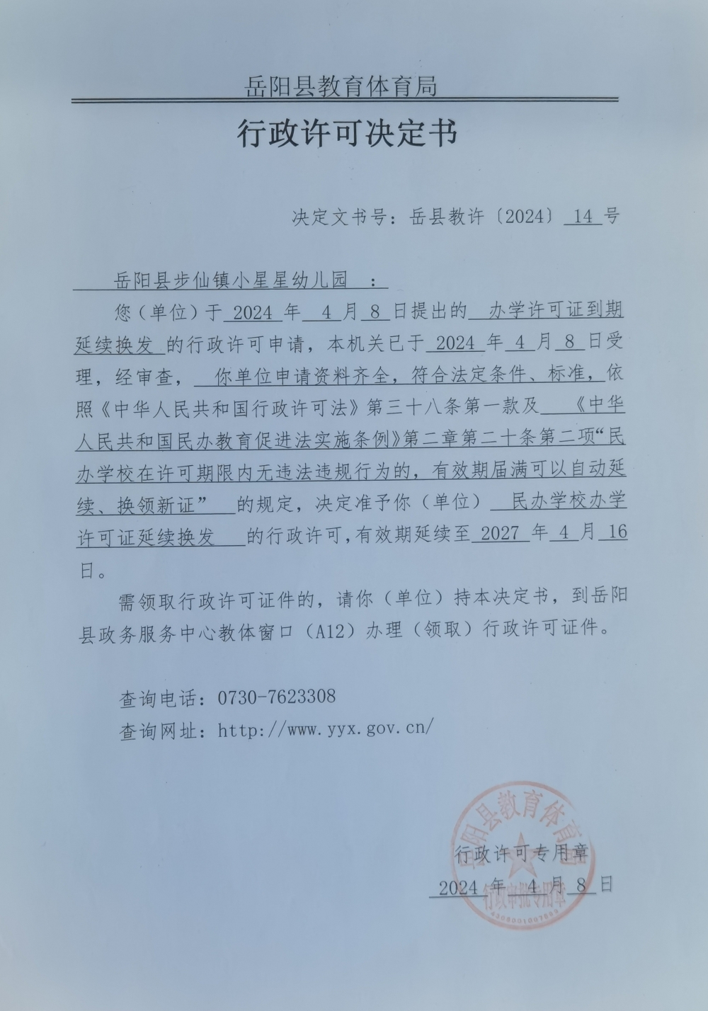 关于准予岳阳县步仙镇小星星幼儿园办学许可证到期延续换发的许可决定