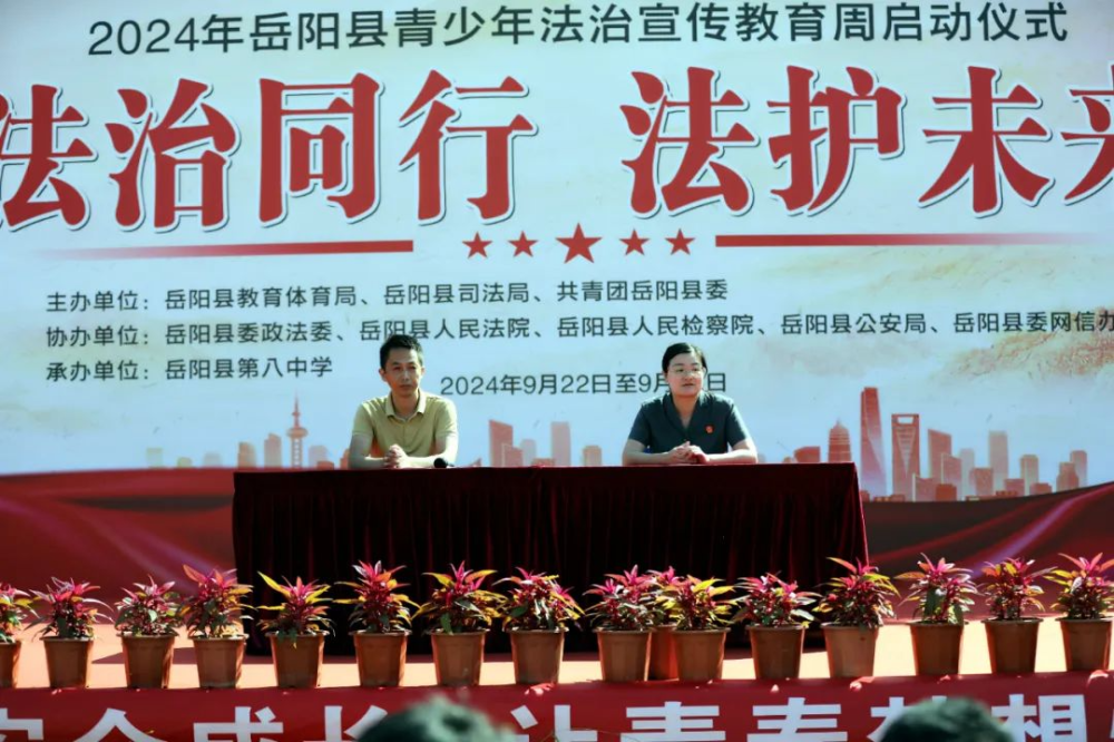 为更好地加强对青少年法治教育,营造良好的校园法治环境,9月23日,由岳阳县教育体育局,岳阳县司法局,共青团岳阳县委举办的“法治同行,法护未来”宣传教育启动仪式在岳阳县第八中学举行。县政法委、县人民法院、县人民检察院、县公安局、县司法局、团县委、县委网信办相关负责人及各县直学校及乡镇中心学校法治专干参加活动。县政法委常务副书记陈登高为普法宣传开启动员令。