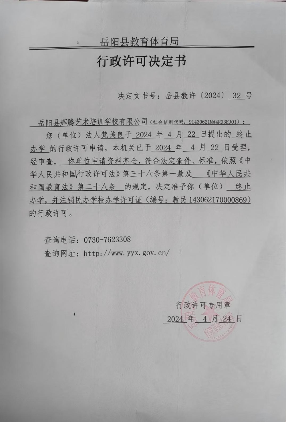 关于准予岳阳县辉腾艺术培训学校办学许可证注销的许可决定