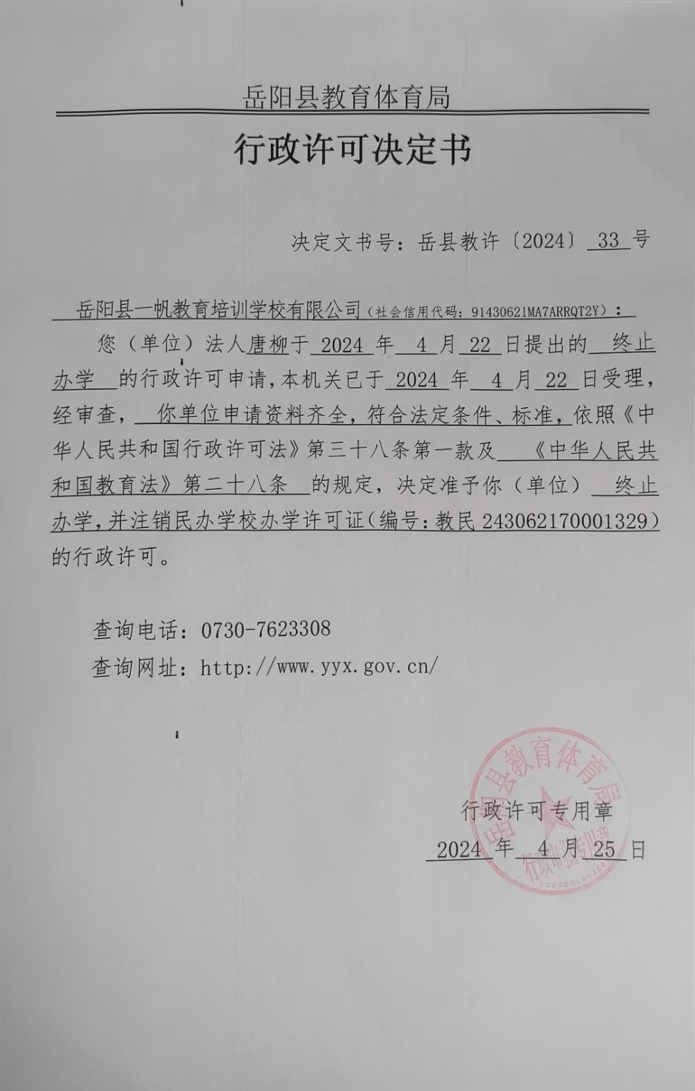 关于准予岳阳县一帆教育培训学校有限公司办学许可证注销的许可决定