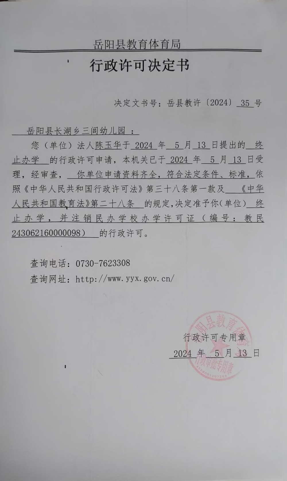 关于准予岳阳县长湖乡三闾幼儿园办学许可证注销的许可决定