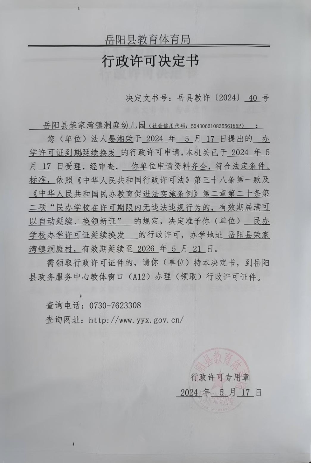 关于准予岳阳县荣家湾镇洞庭幼儿园办学许可证到期延续换发的许可决定