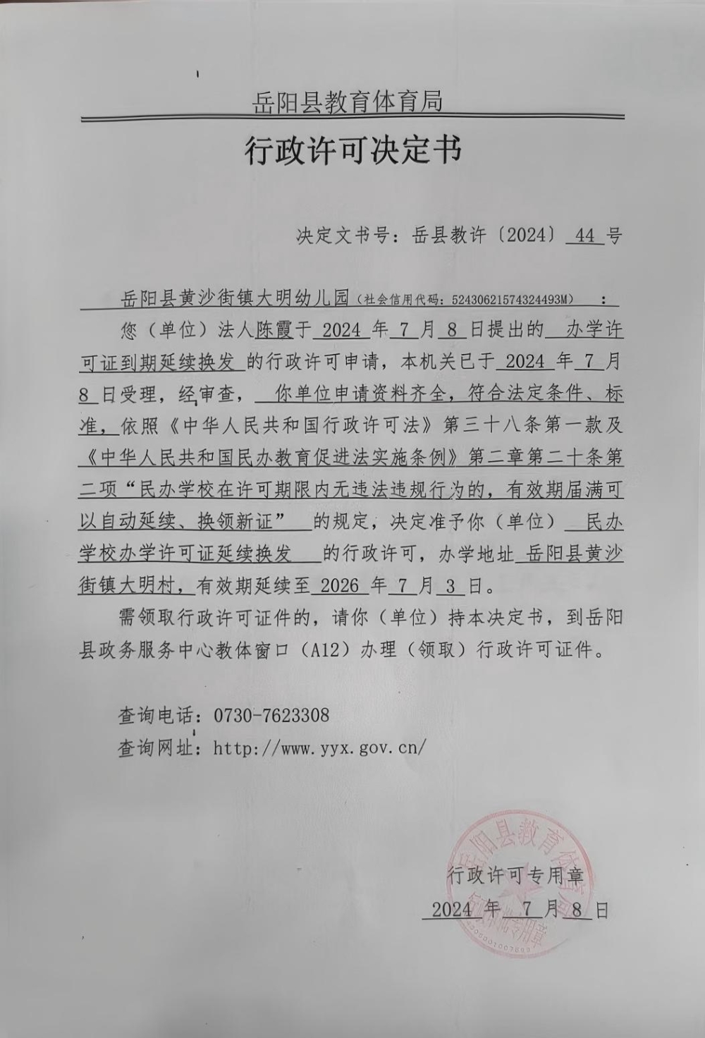 关于准予岳阳县黄沙街镇大明幼儿园办学许可证到期延续换发的许可决定