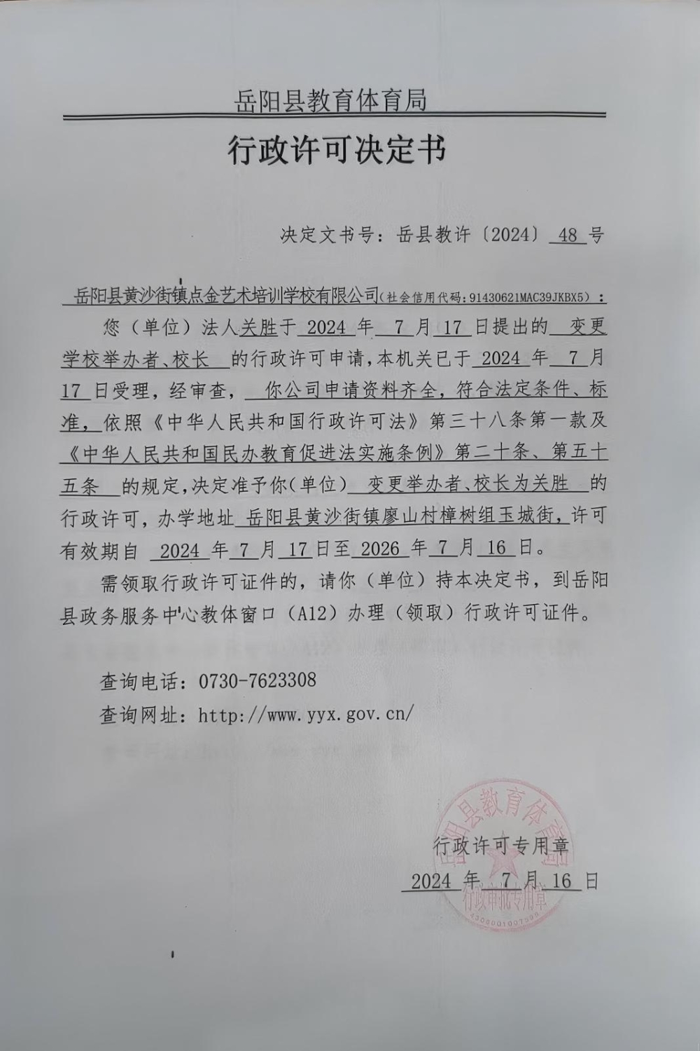 关于准予岳阳县黄沙街镇点金艺术培训学校有限公司办学许可证到变更的许可决定