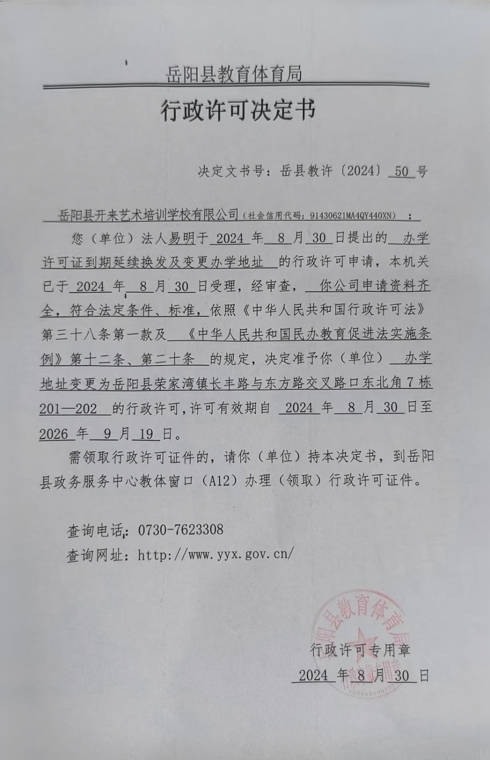 关于准予岳阳县开来艺术培训学校有限公司办学许可证变更、到期延续换发的许可决定