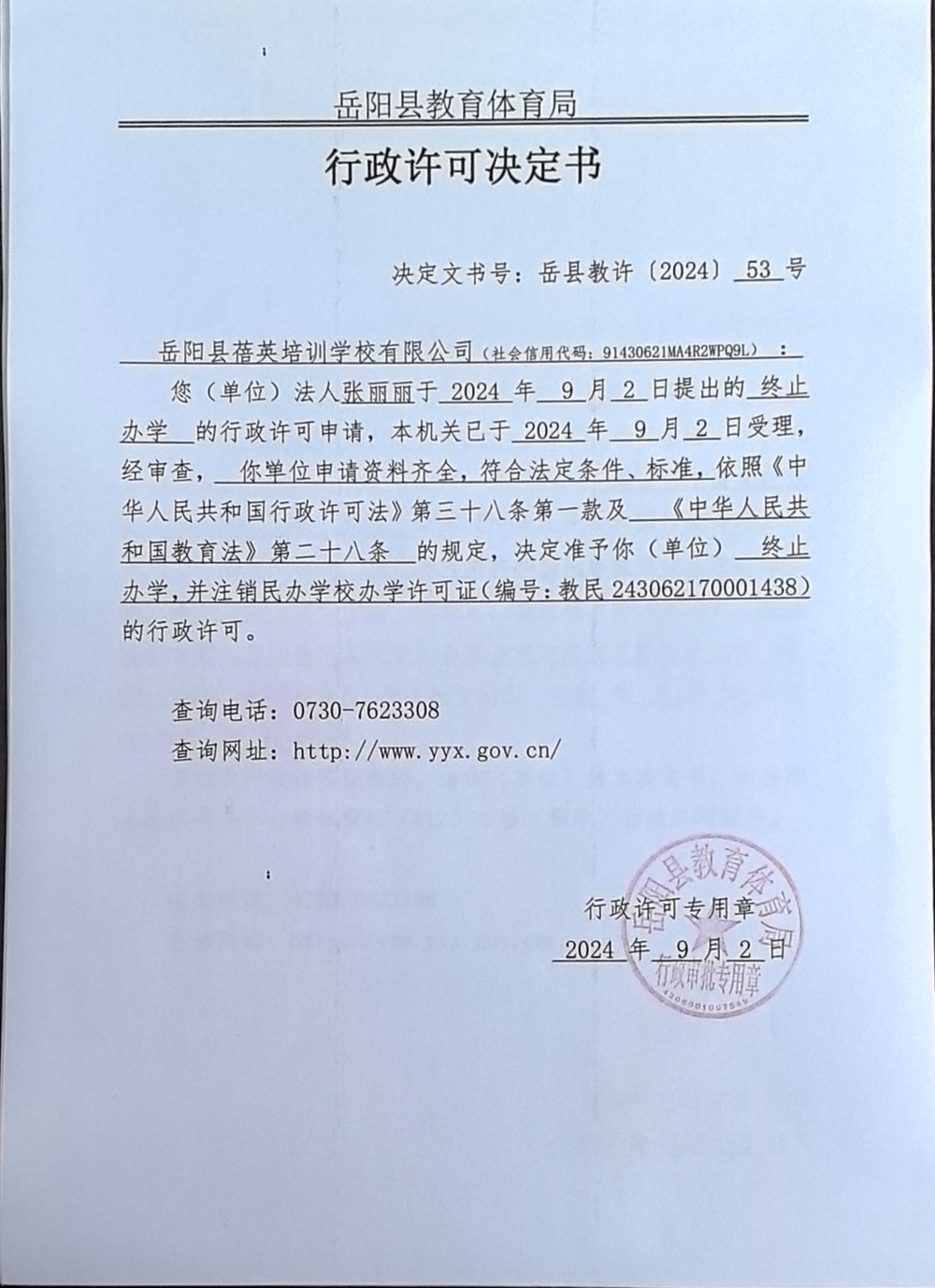 关于准予岳阳县蓓英培训学校有限公司办学许可证注销的许可决定