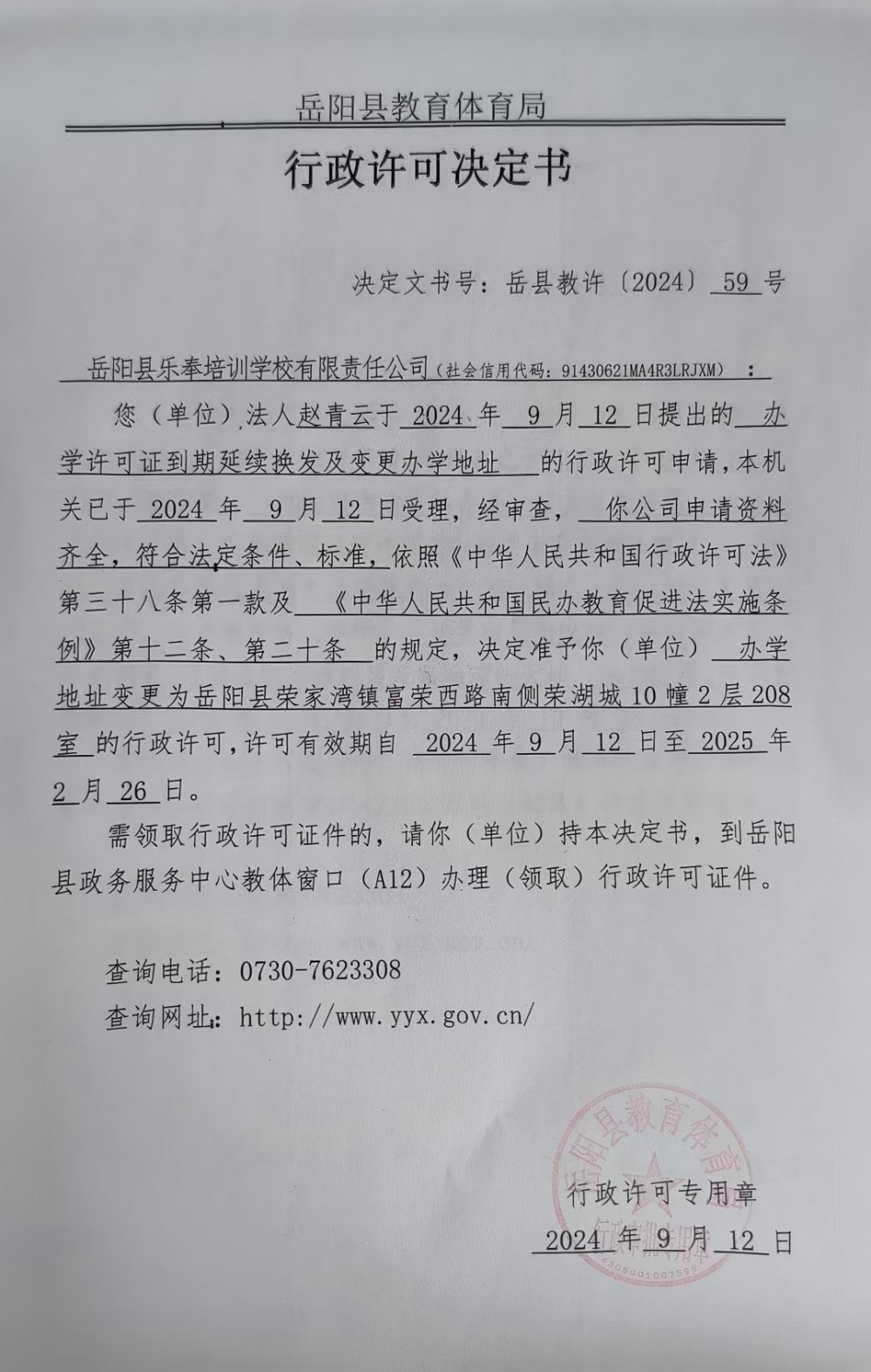 关于准予岳阳县乐奉培训学校有限责任公司办学许可证变更、到期延续换发的许可决定
