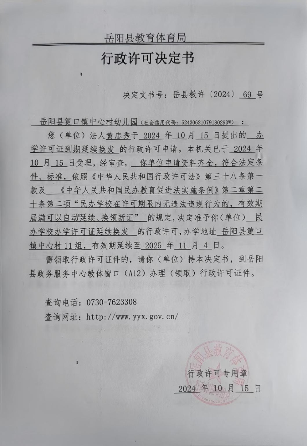 关于准予岳阳县筻口镇中心村幼儿园办学许可证到期延续换发的许可决定