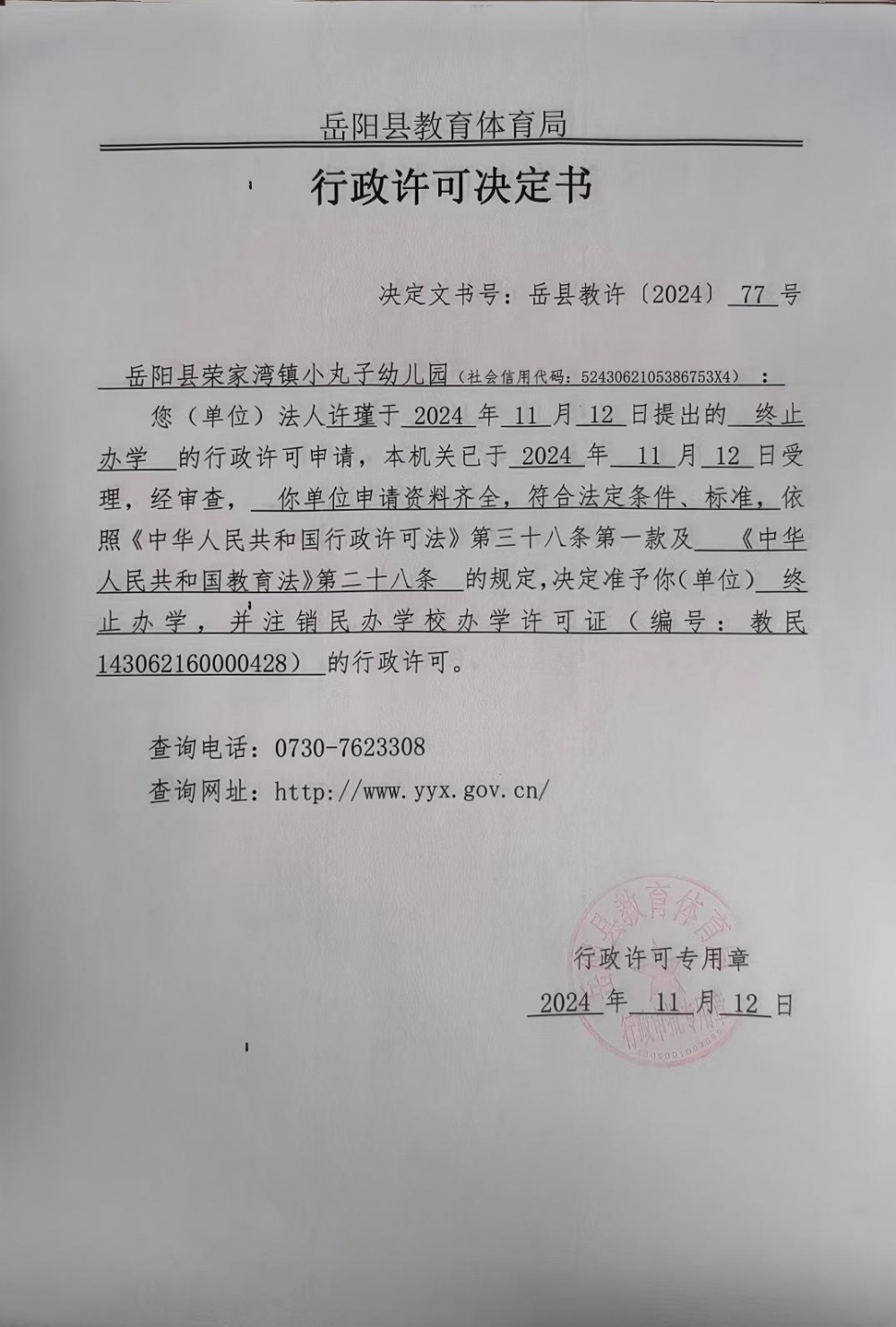 关于准予岳阳县荣家湾镇小丸子幼儿园办学许可证到期延续换发的许可决定