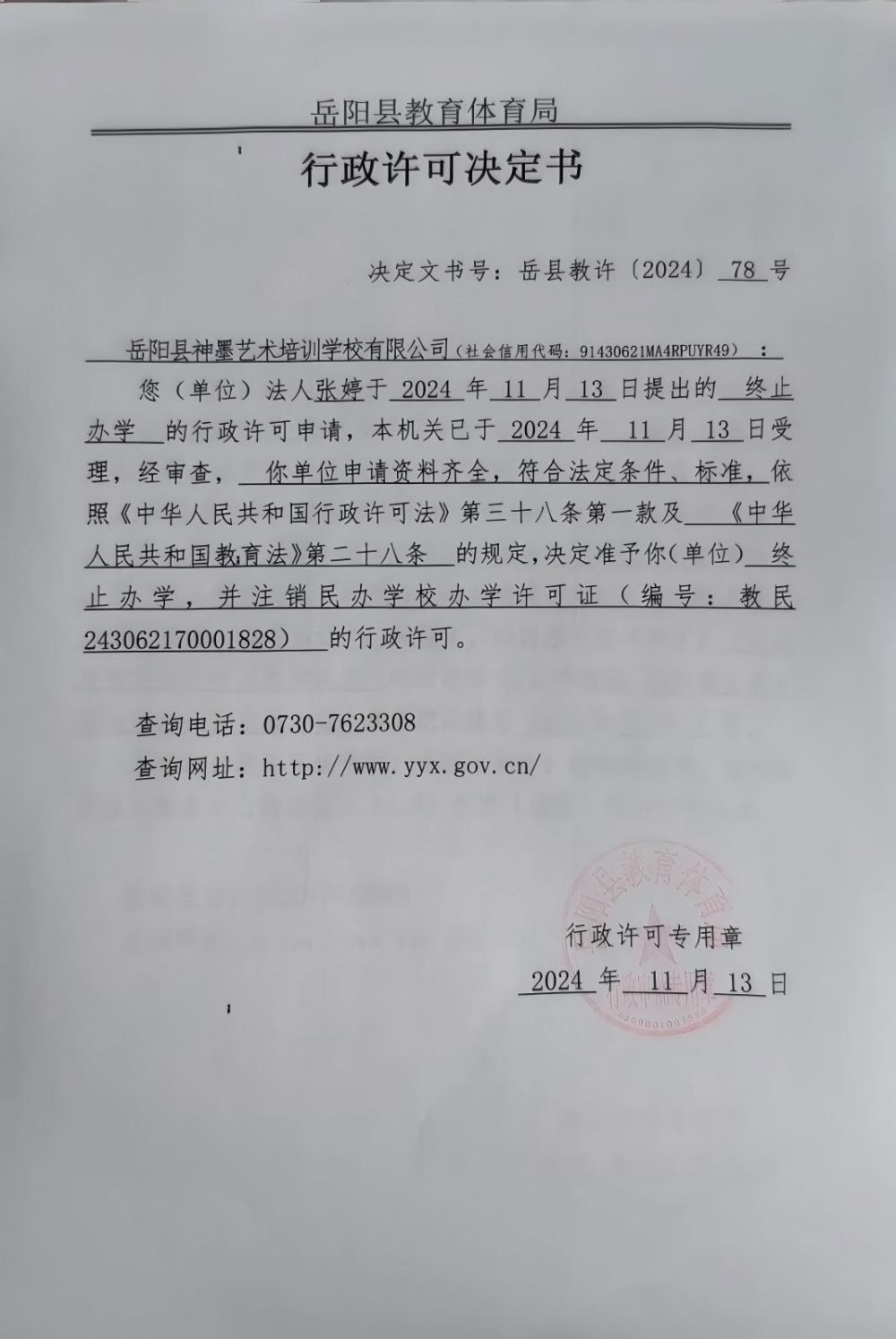 关于准予岳阳县神墨艺术培训有限公司办学许可证注销的许可决定