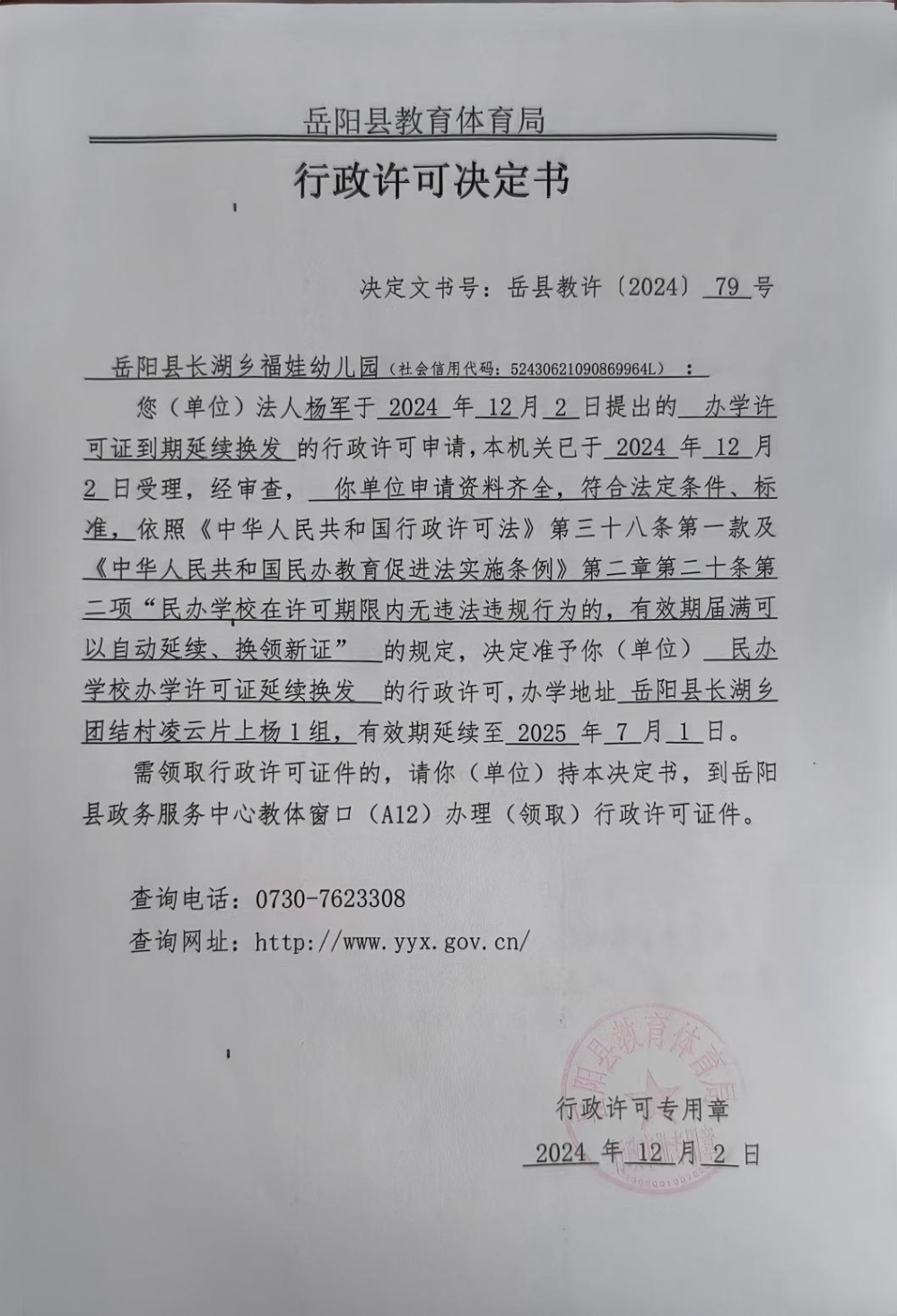 关于准予岳阳县长湖乡福娃幼儿园办学许可证到期延续换发的许可决定