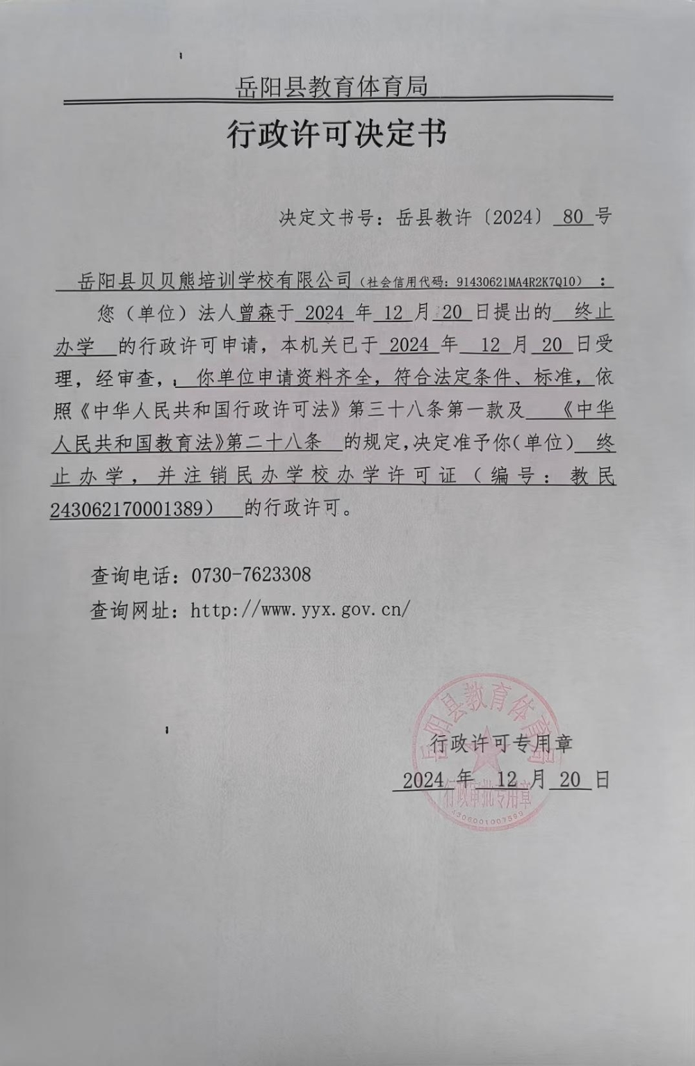 关于准予岳阳县贝贝熊培训学校有限公司办学许可证注销的许可决定