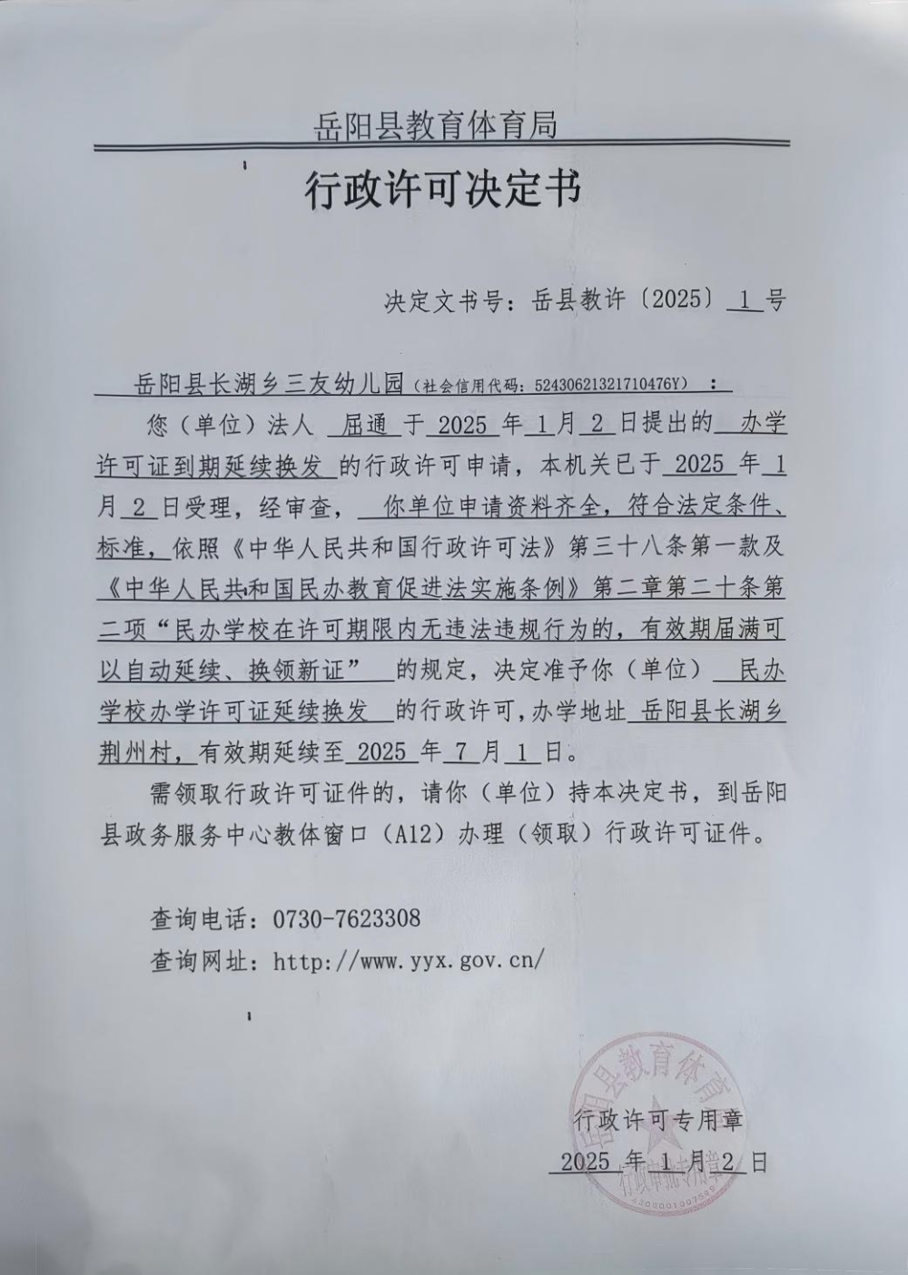 关于准予岳阳县长湖乡三友幼儿园办学许可证到期延续换发的许可决定