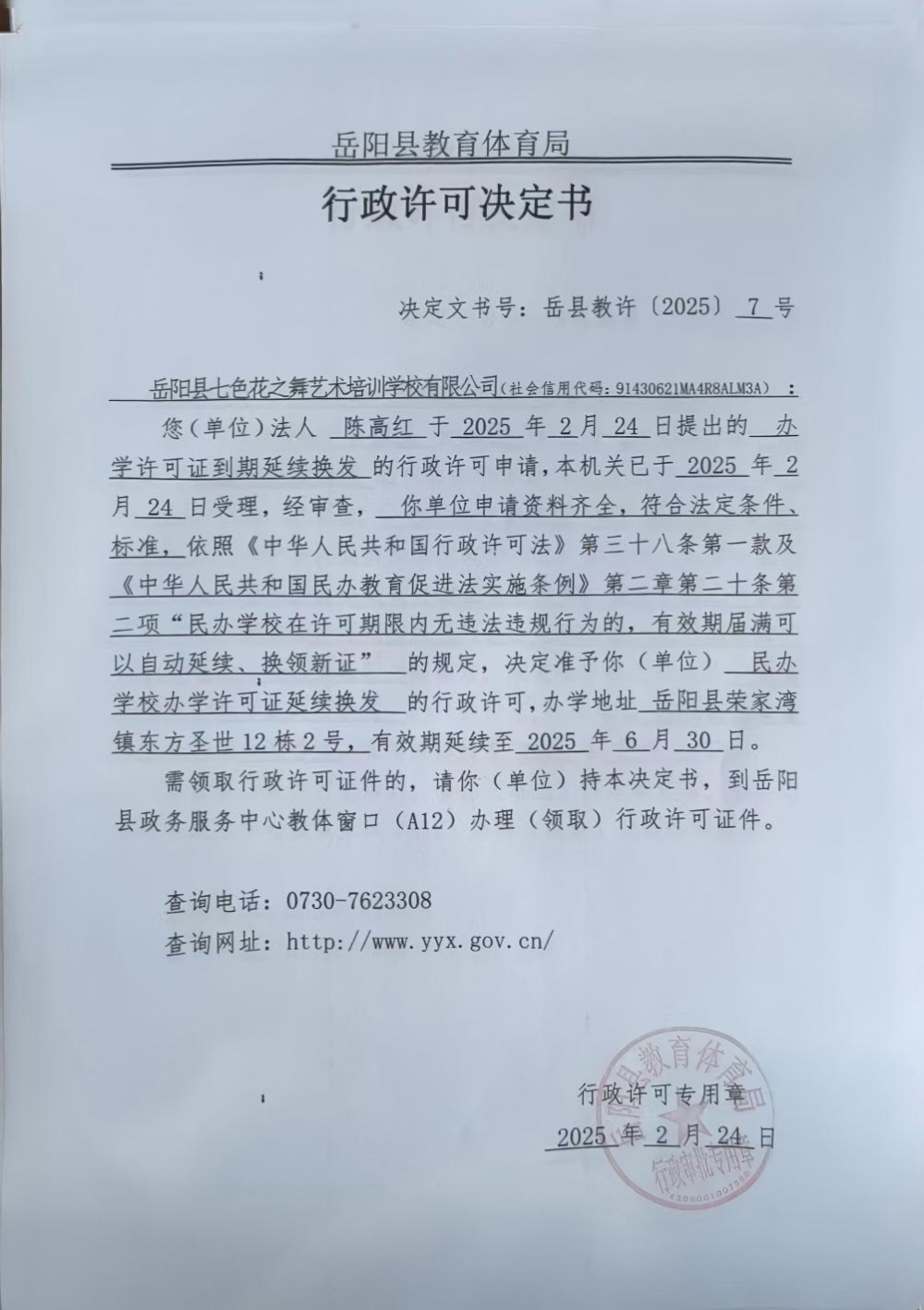 关于准予岳阳县七色花之舞艺术培训学校有限公司办学许可证到期延续换发的许可决定