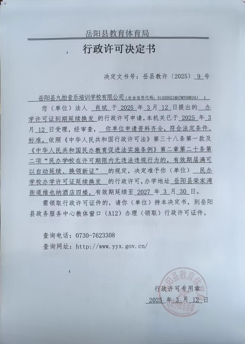 关于准予岳阳县九拍音乐培训学校有限公司办学许可证到期延续换发的许可决定