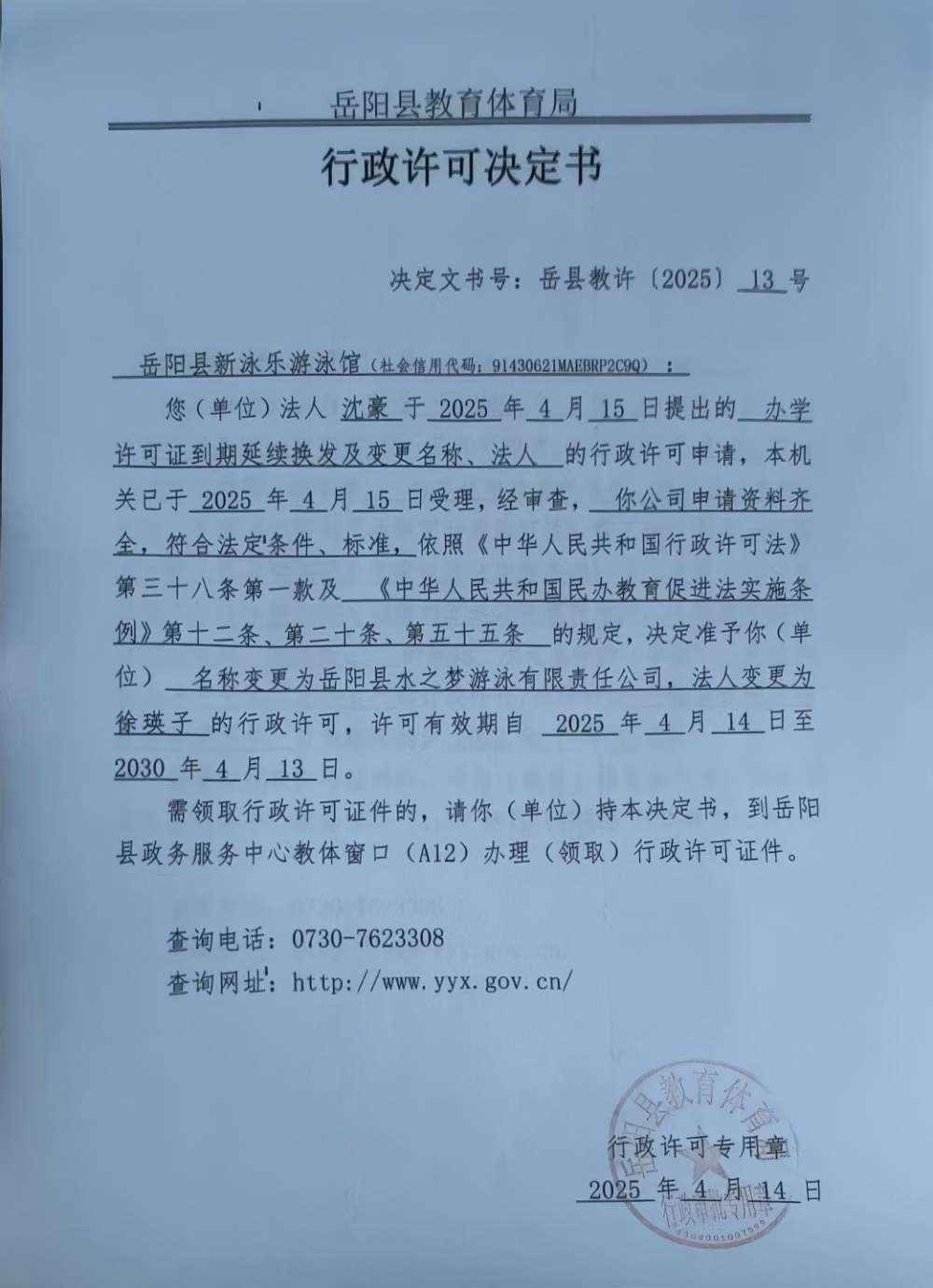 关于准予岳阳县水之梦游泳有限责任公司办学许可证变更的许可决定