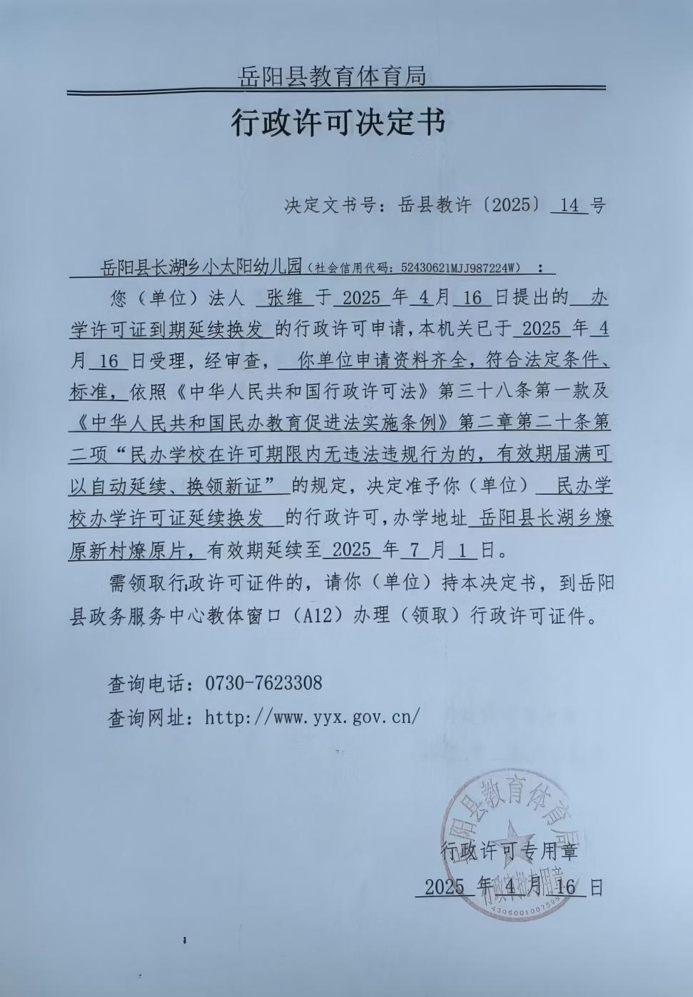 关于准予岳阳县小太阳幼儿园办学许可证到期延续换发的许可决定