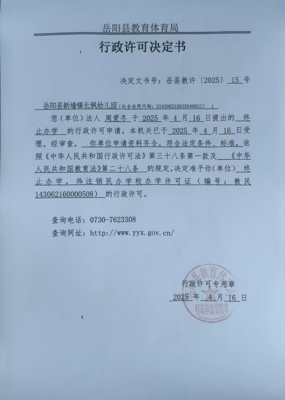 关于准予岳阳县新墙镇长枫幼儿园办学许可证注销的许可决定