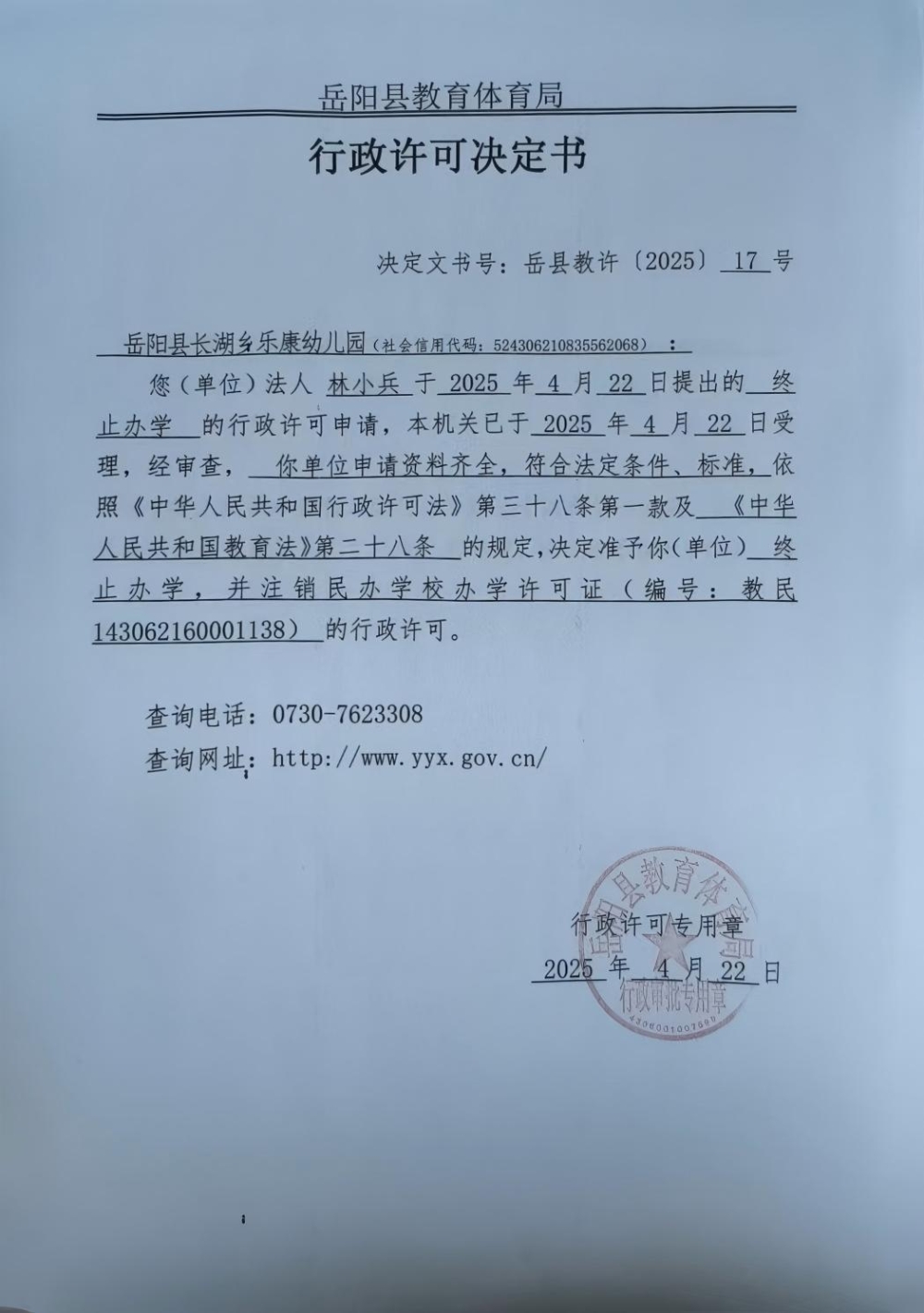 关于准予岳阳县长湖乡乐康幼儿园办学许可证注销的许可决定