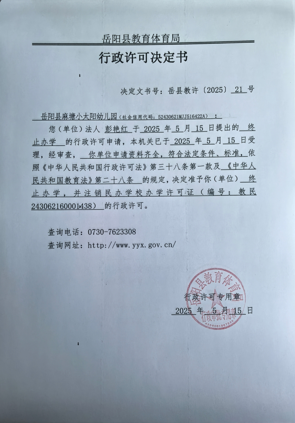 关于准予岳阳县麻塘小太阳幼儿园办学许可证注销的许可决定