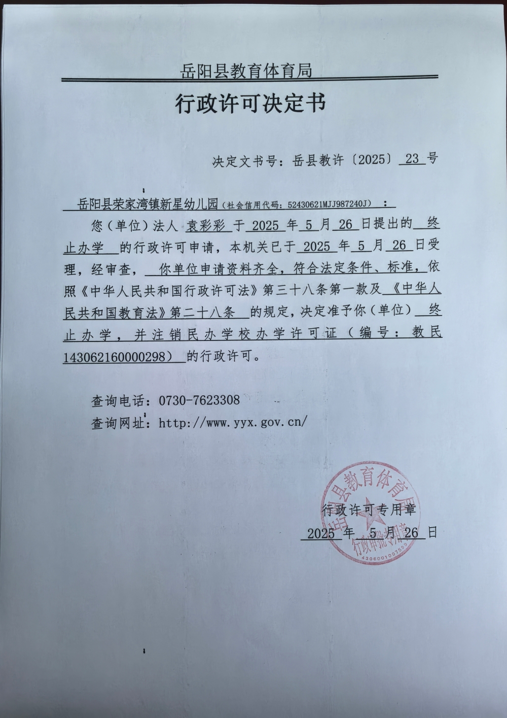 关于准予岳阳县荣家湾镇新星幼儿园办学许可证注销的许可决定