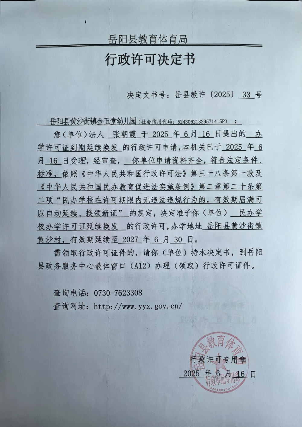 关于准予岳阳县黄沙街镇金玉堂幼儿园2025年办学许可证到期延续换发的许可决定