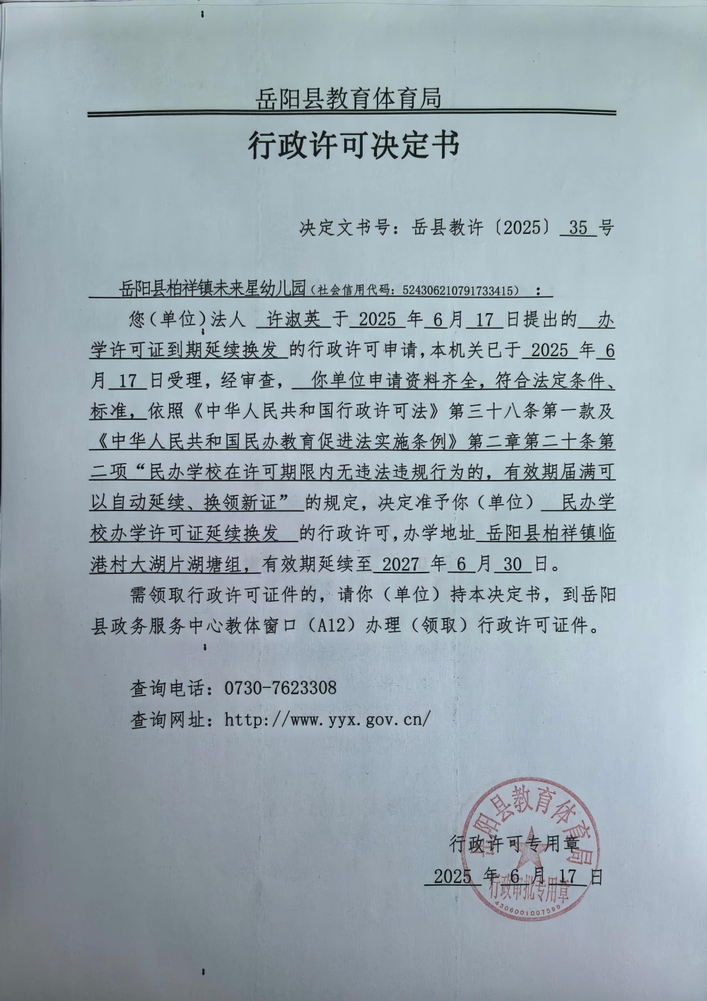 关于准予岳阳县柏祥镇未来星幼儿园2025年办学许可证到期延续换发的许可决定