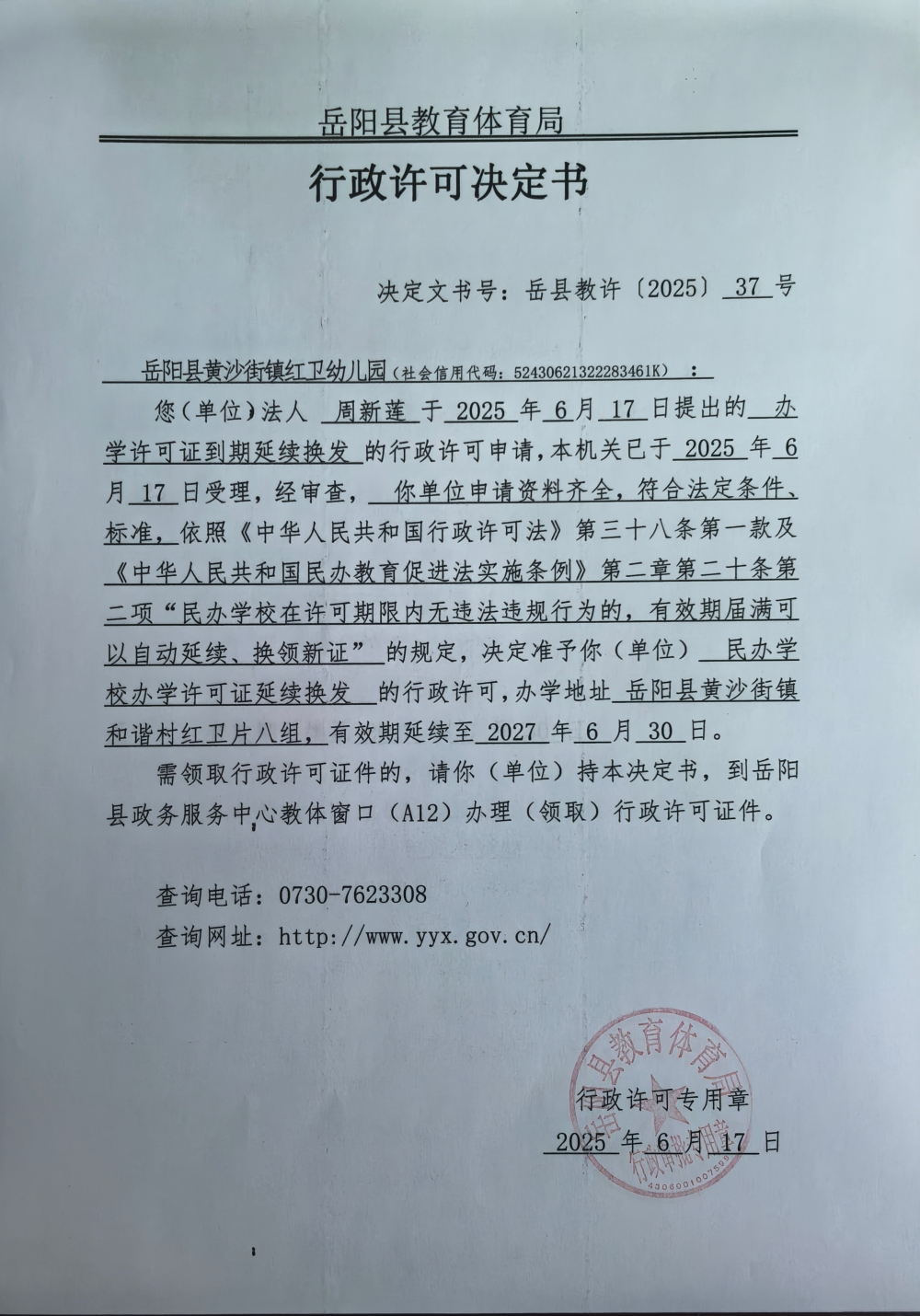 关于准予岳阳县黄沙街镇红卫幼儿园办学许可证到期延续换发的许可决定