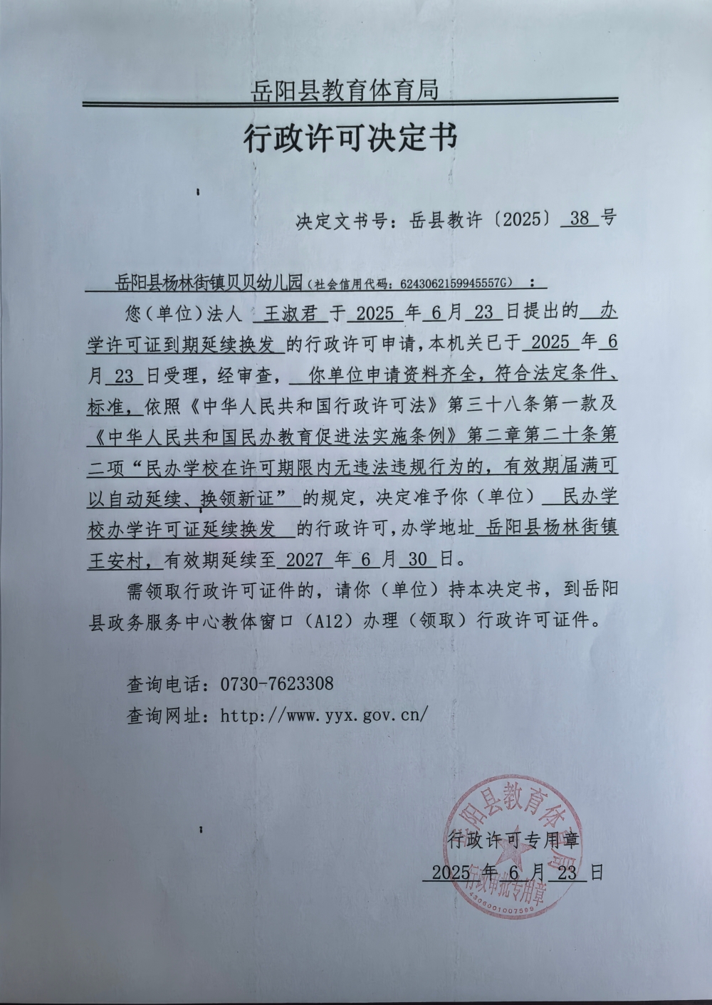 关于准予岳阳县杨林街镇贝贝幼儿园2025年办学许可证到期延续换发的许可决定