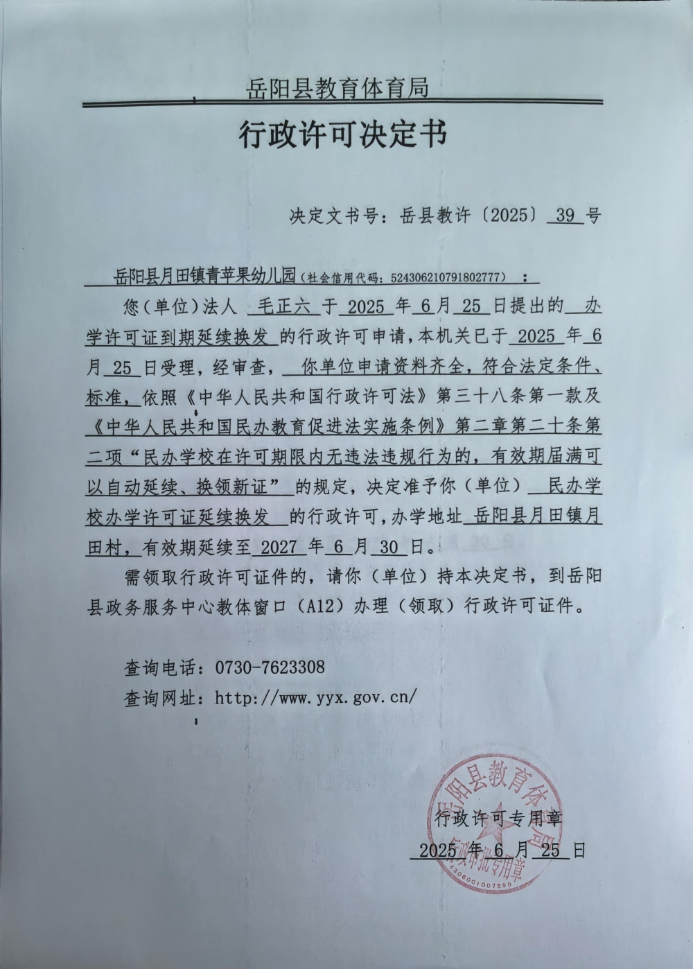 关于准予岳阳县月田镇青苹果幼儿园办学许可证到期延续换发的许可决定