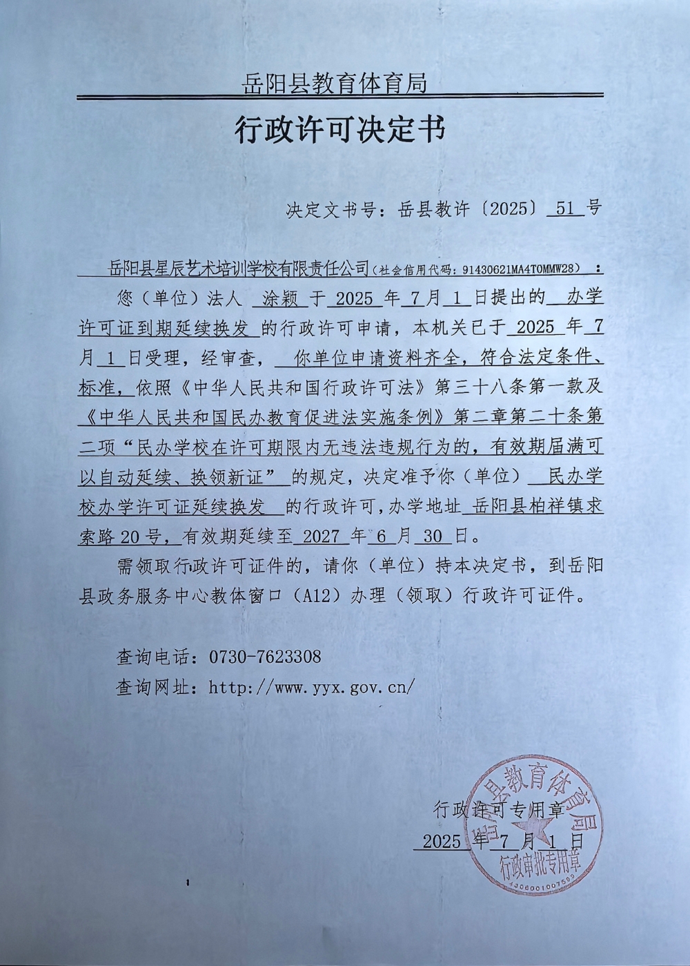 关于准予岳阳县星辰艺术培训学校有限责任公司办学许可证到期延续换发的许可决定