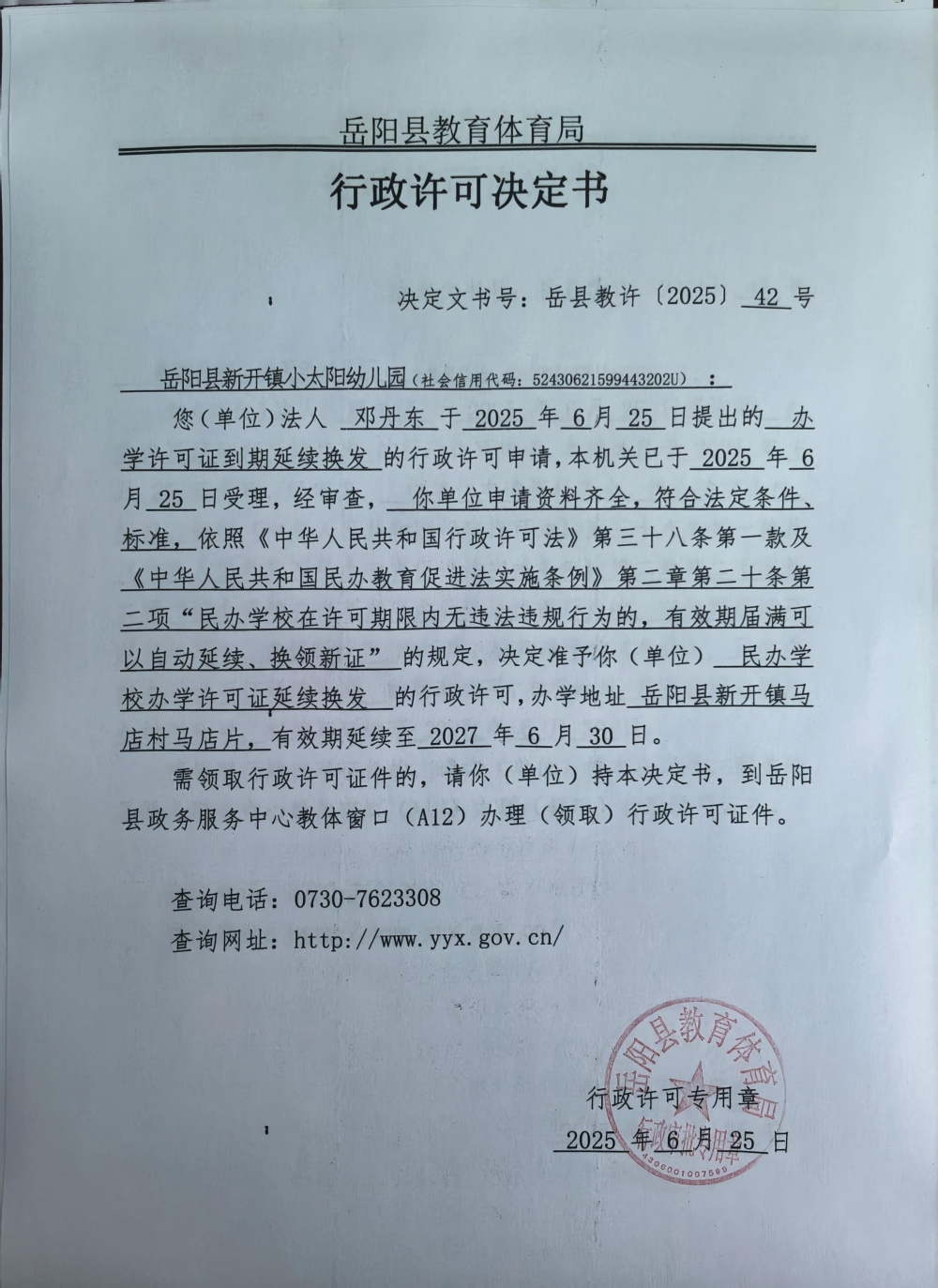 关于准予岳阳县新开镇小太阳幼儿园2025年办学许可证到期延续换发的许可决定