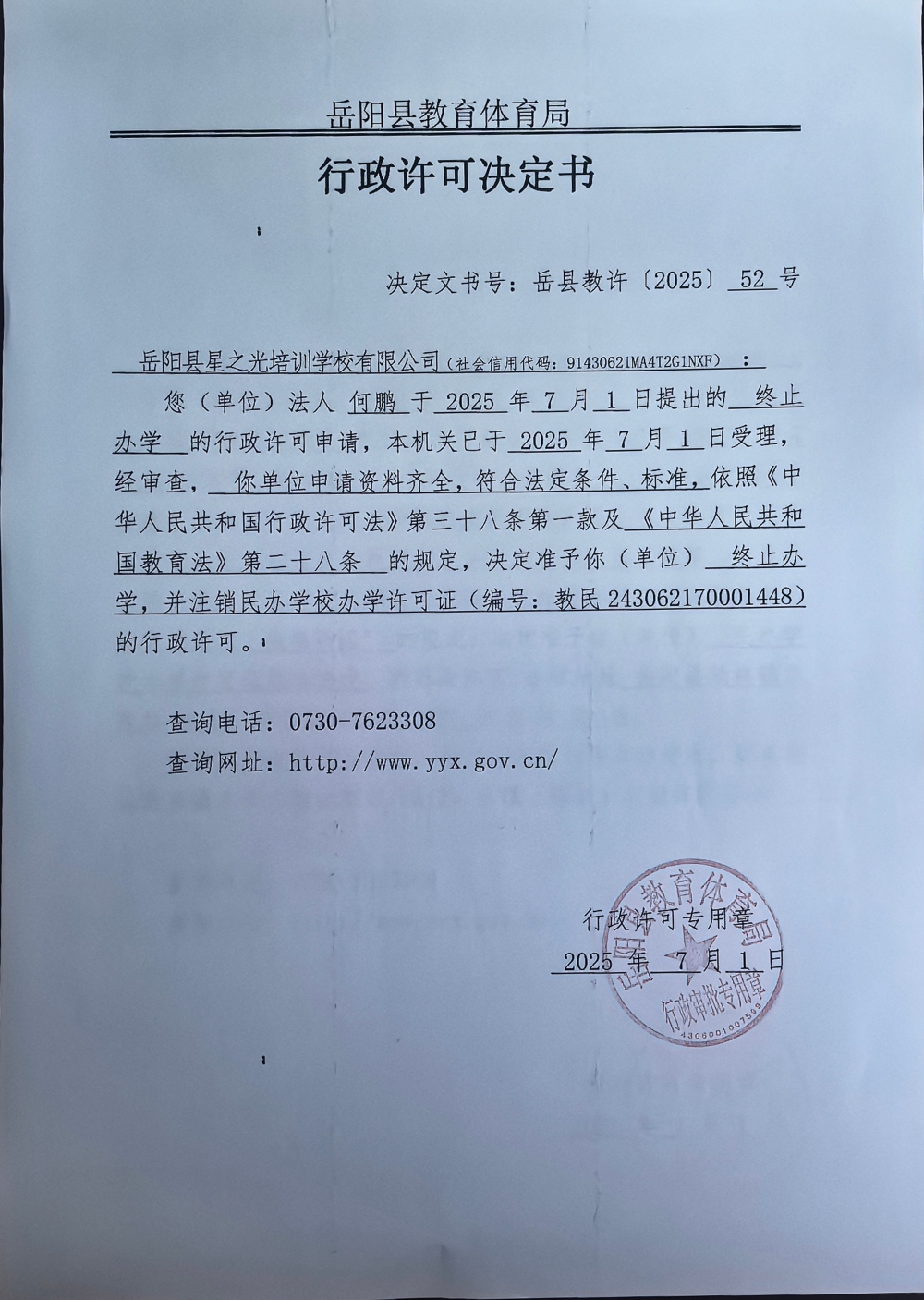 关于准予岳阳县星之光培训学校有限公司办学许可证注销的许可决定