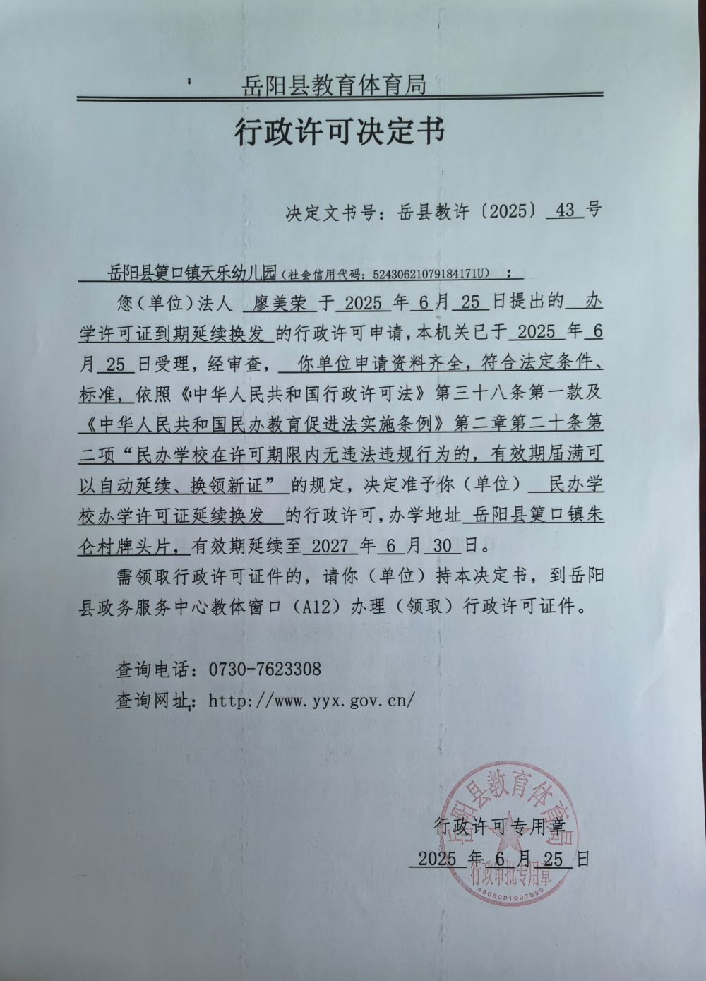 关于准予岳阳县筻口镇天乐幼儿园2025年办学许可证到期延续换发的许可决定