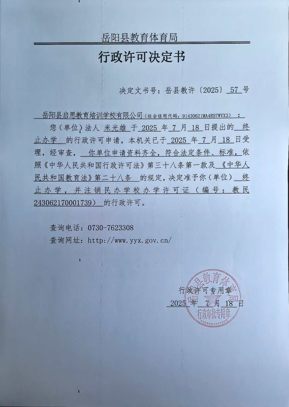 关于准予岳阳县启思教育培训学校有限公司办学许可证注销的许可决定