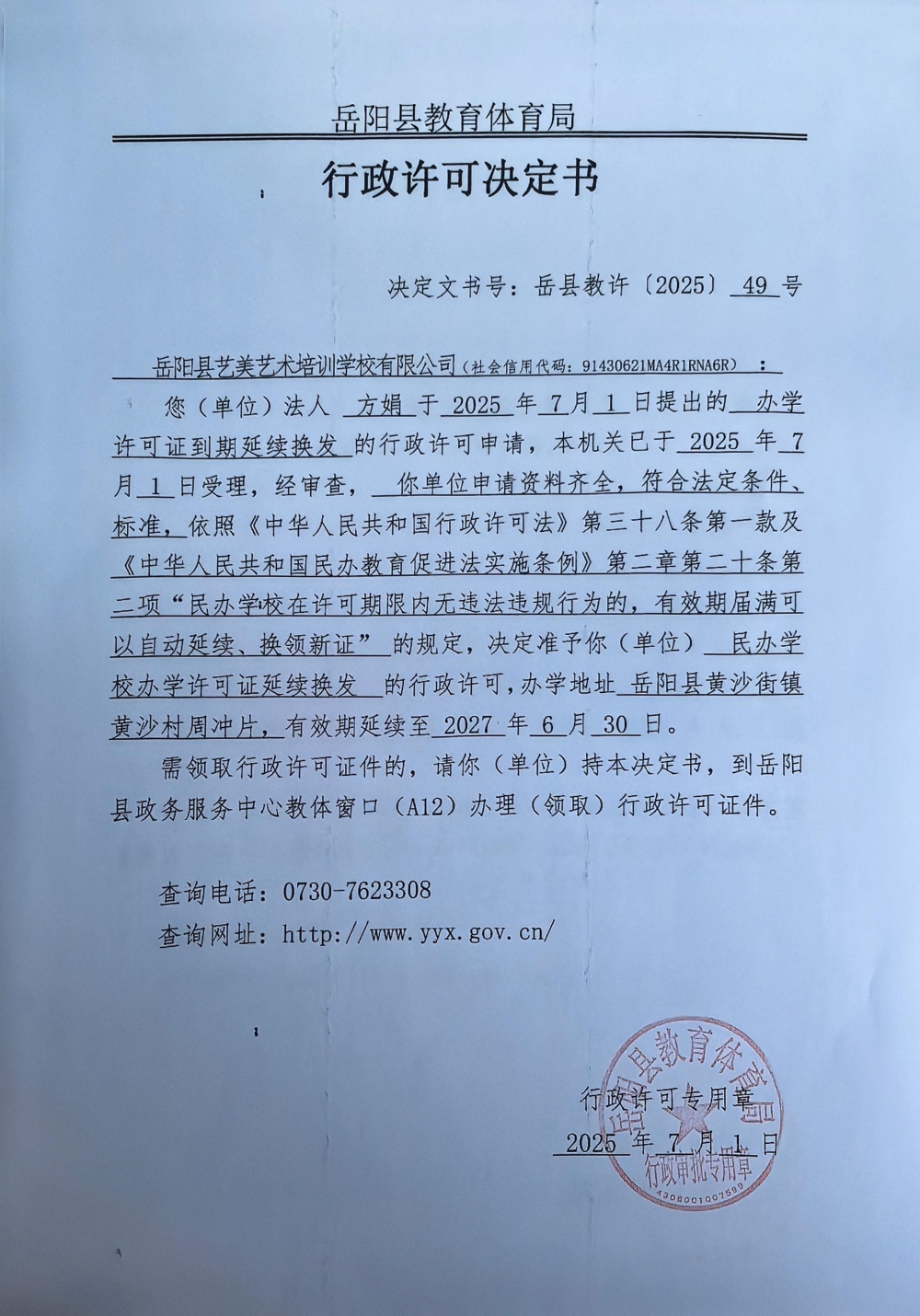 关于准予岳阳县艺美艺术培训学校有限公司办学许可证到期延续换发的许可决定