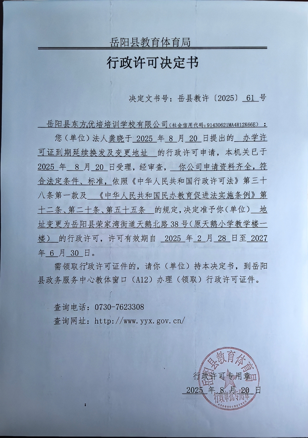 关于准予岳阳县东方优培培训学校有限公司办学许可证变更地址及到期延续换发的许可决定