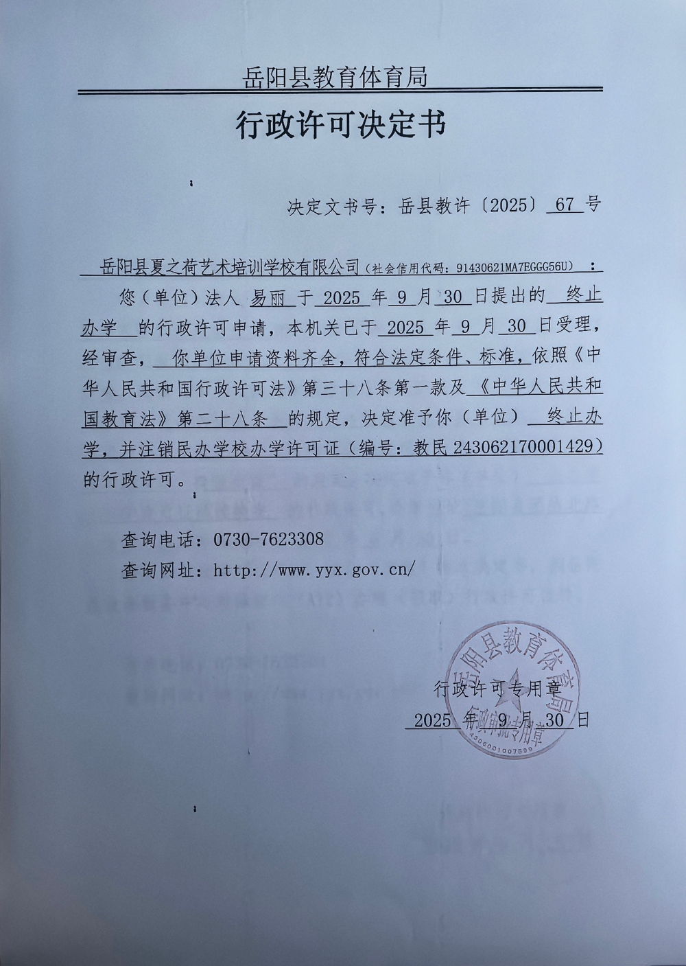 关于准予岳阳县夏之荷艺术培训学校有限公司办学许可证注销的许可决定